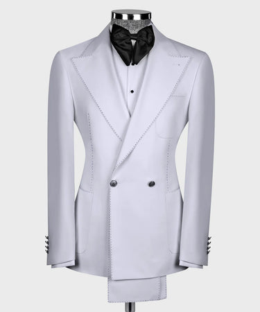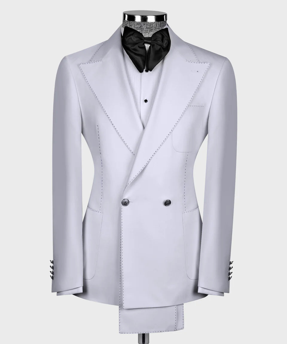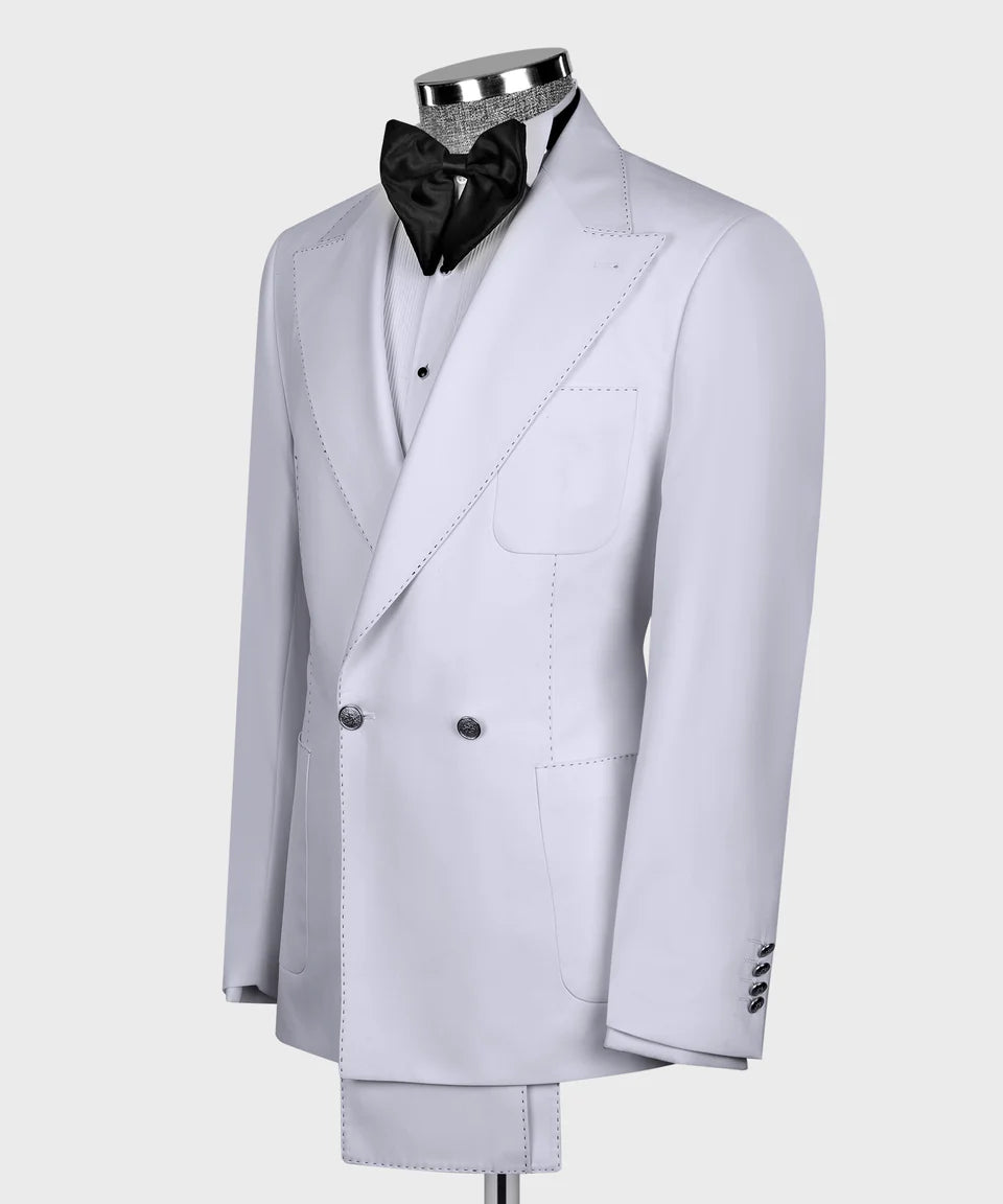 Make a sophisticated and stylish statement with our White Double Breasted Tuxedo featuring a White Shawl Lapel. This elegant two-piece suit includes a luxurious white double-breasted jacket with a classic white shawl lapel and classic fit white trousers with a subtle satin stripe detail on the side. Perfect for weddings, galas, and any special event where you want to exude modern elegance. Choose this Black Tuxedo Style for a timeless and refined look.