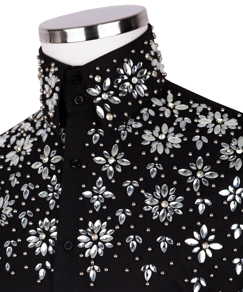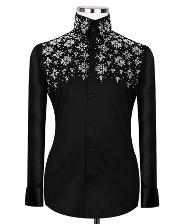 Elevate your wardrobe with The Black Tuxedo Style's Classic Stones Detailed Shirt. This black shirt features exquisite gold stone detailing across the shoulders and upper chest, adding a touch of luxury to a classic design. Perfect for special occasions or making a statement, this shirt combines sophistication with unique embellishments.
