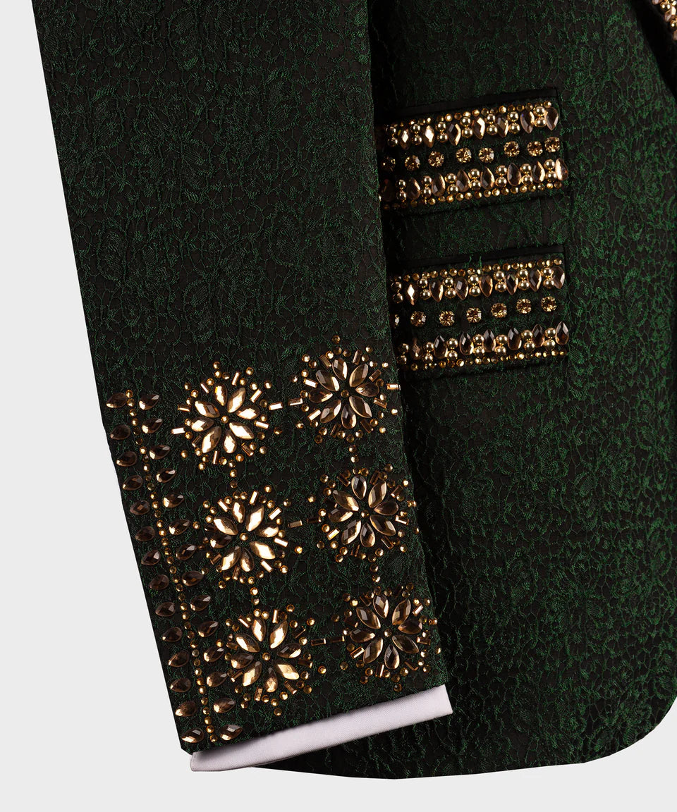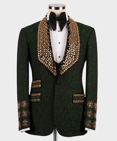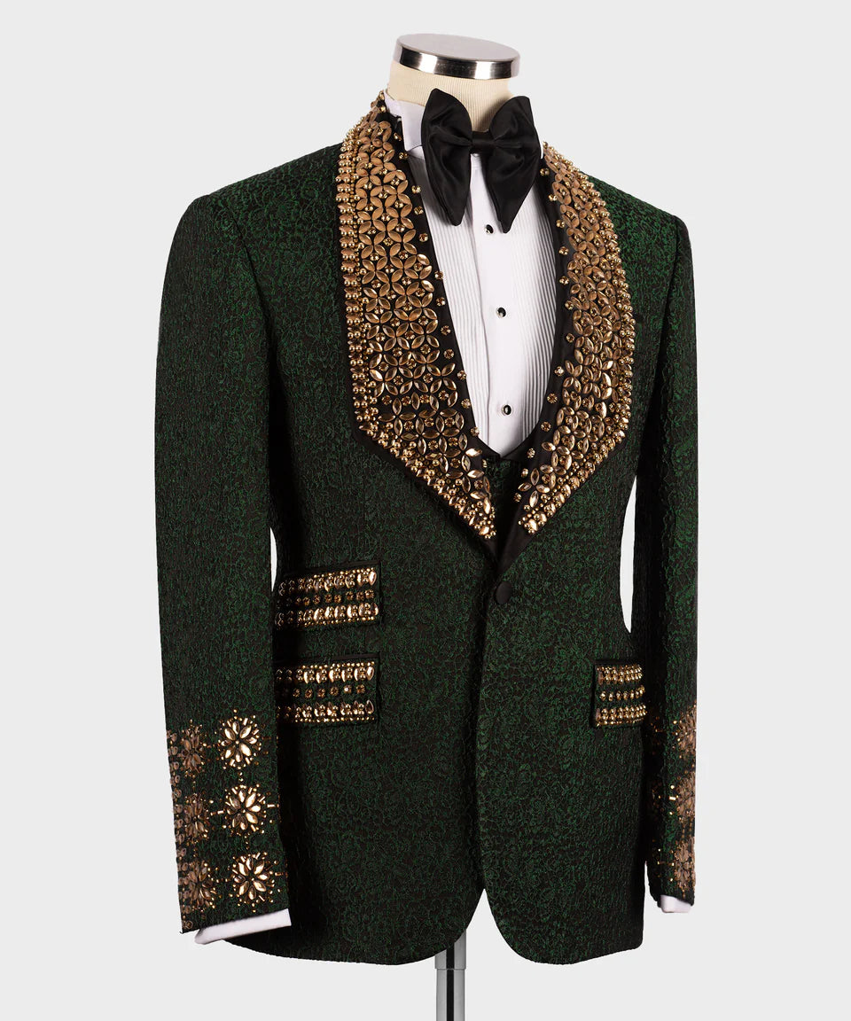 Black Tuxedo Style | Emerald Green Tuxedo with Gold & Black Stone Embellishments (3 Piece)