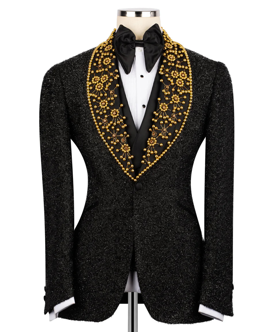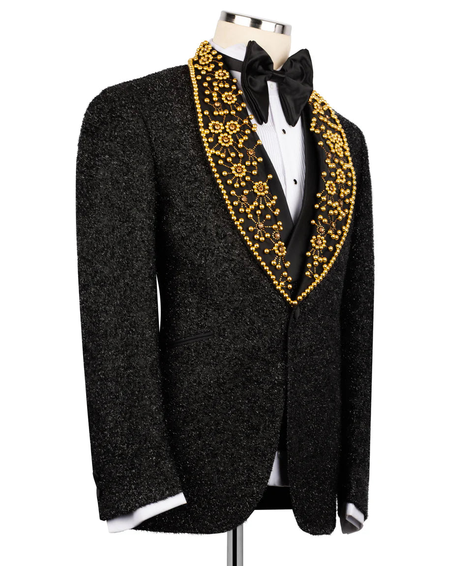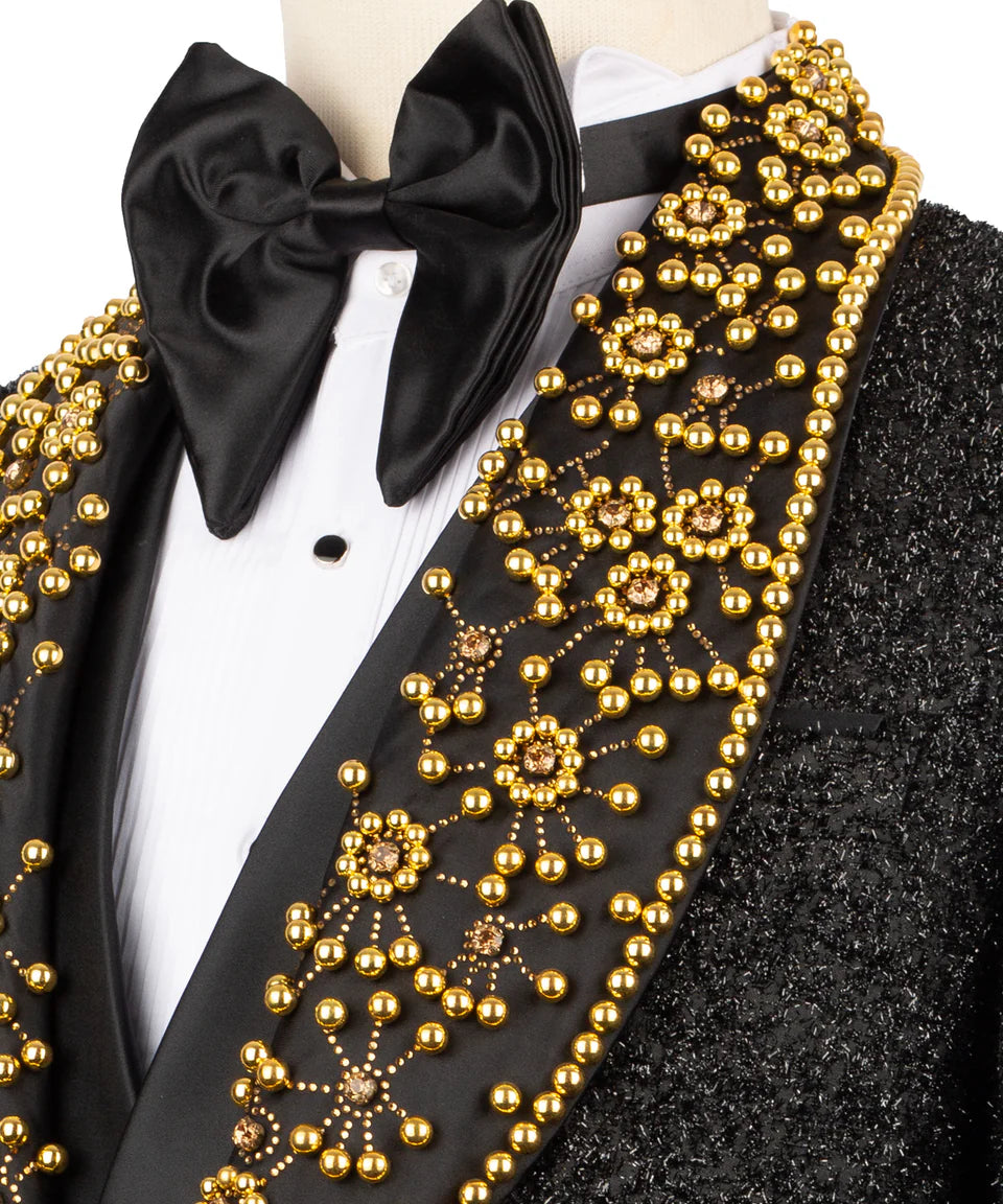 Black Tuxedo Style | Gold Floral Bead Embellished 3 Piece Tuxedo
