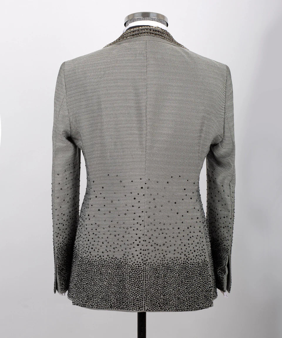 Make an unforgettable impression with this luxurious Grey Tuxedo with Heavy Black Stone Embellishments, a striking three-piece set from Black Tuxedo Style. This elegant one-button tuxedo jacket features a sophisticated black shawl lapel and is lavishly adorned with black stones, creating a bold and glamorous look. The set includes a matching vest and coordinating black trousers, completing the distinguished ensemble. Perfect for red carpet events, upscale parties, and any occasion where you want to command attention. This unique three-piece suit from Black Tuxedo Style is sure to make you stand out.