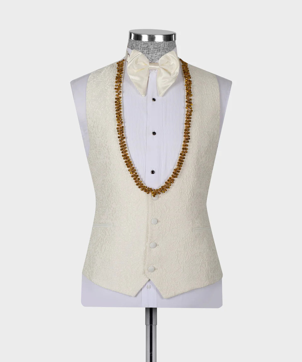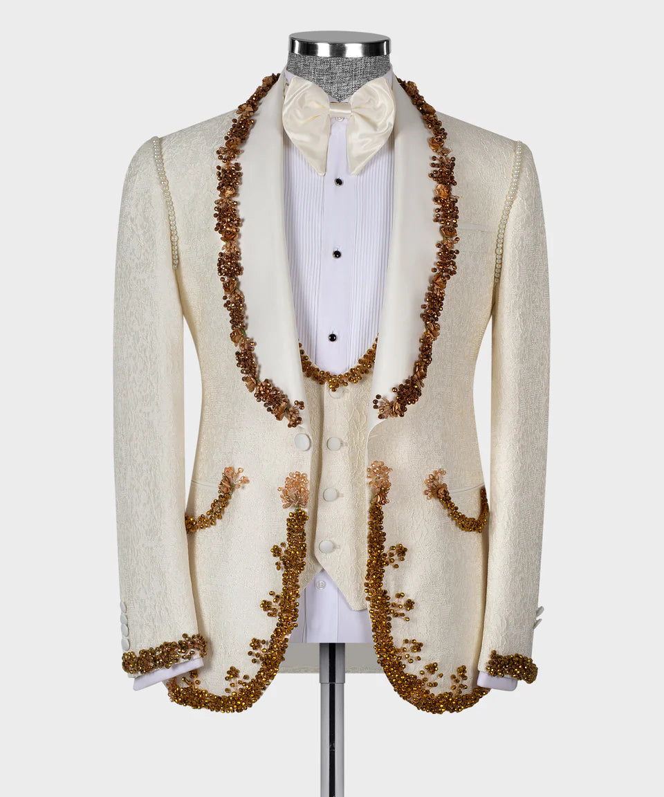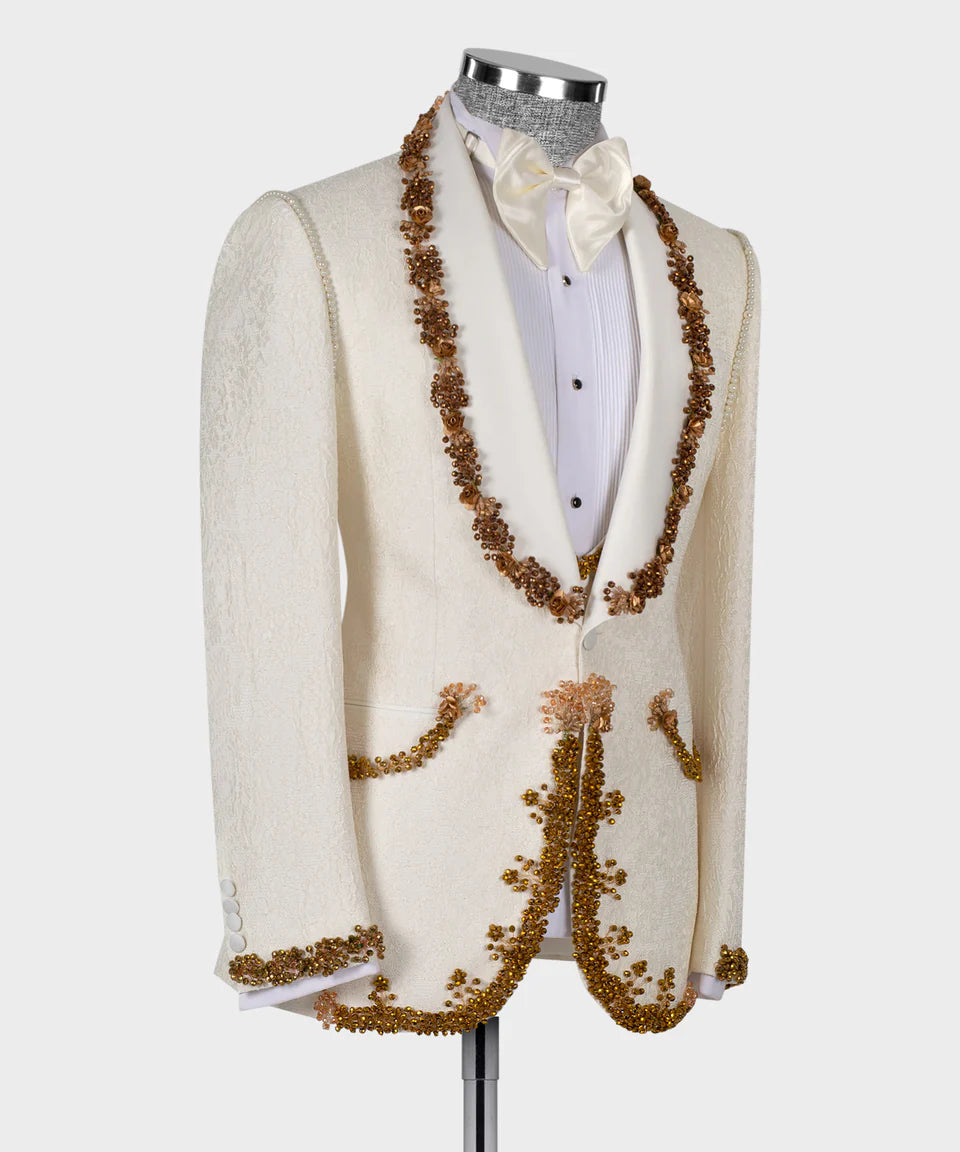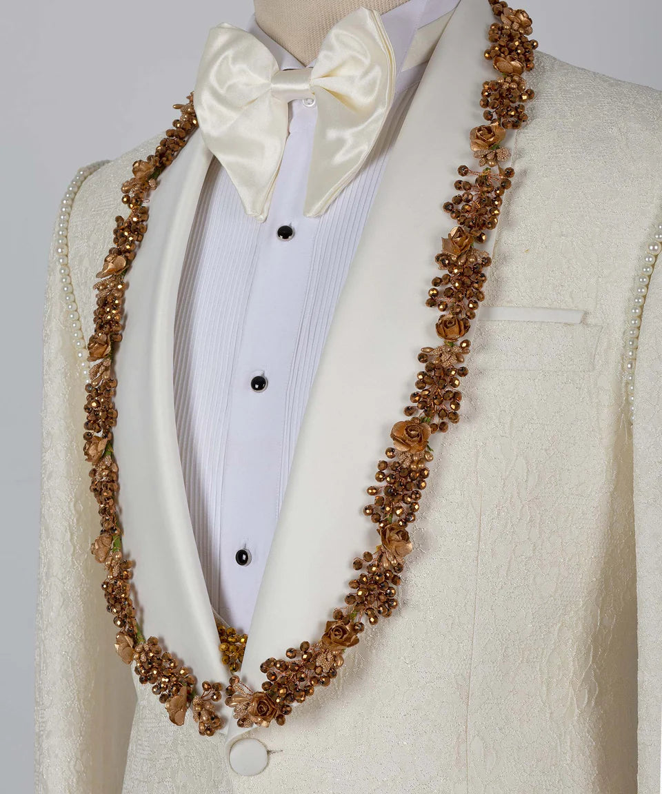 Black Tuxedo Style is proud to present our Beige Jacquard Tuxedo featuring Gold Appliques, Beads, and a White Shawl Lapel. This luxurious three-piece suit includes a beautifully textured beige jacquard blazer adorned with intricate gold appliques and beadwork, a matching vest, and coordinating pants. The blazer features a sophisticated white satin shawl lapel and a modern one-button closure. Perfect for weddings, proms, and any special occasion where you want to make a statement of opulence and style. This Unique Tuxedo Style from Black Tuxedo Style is sure to turn heads.