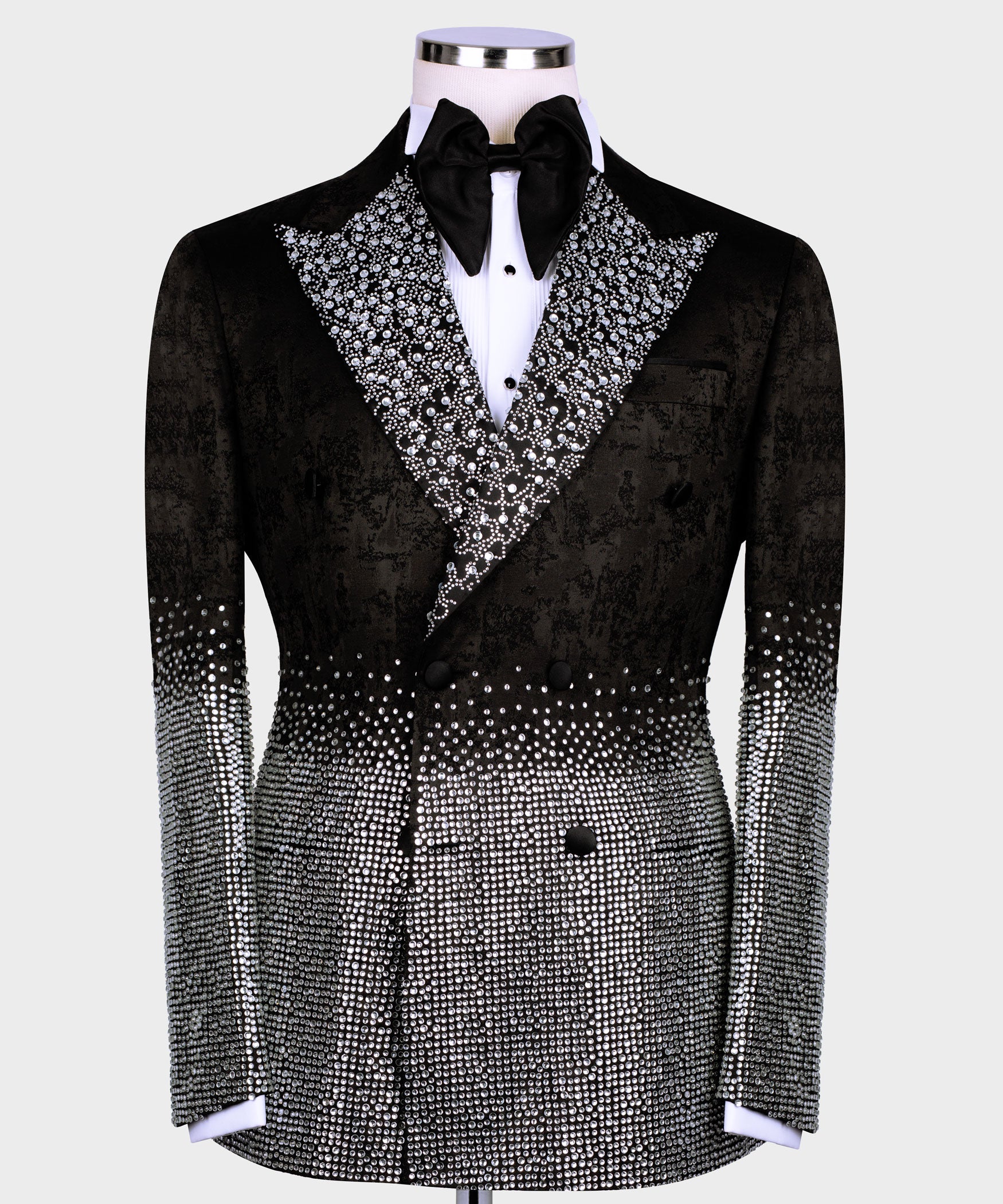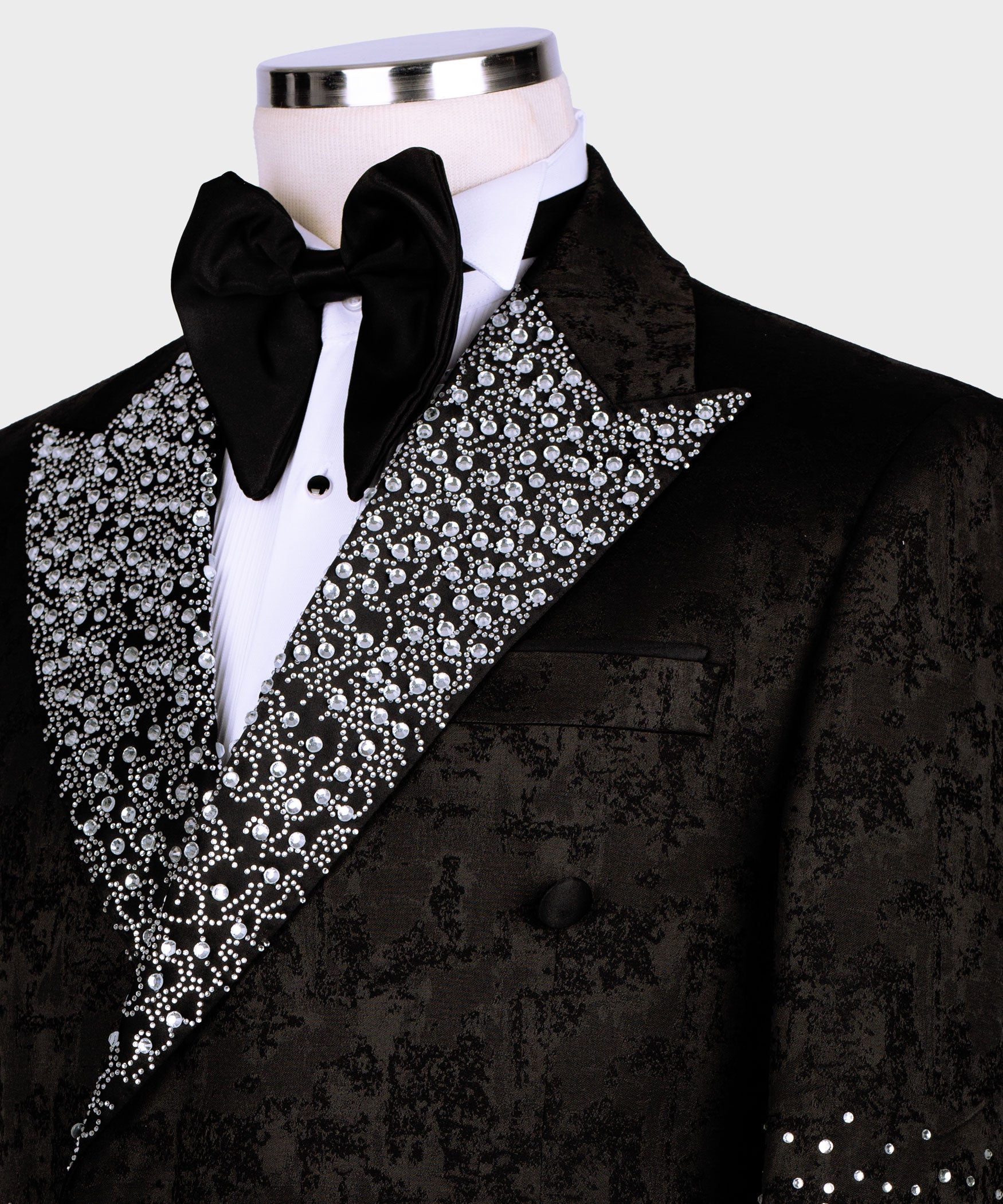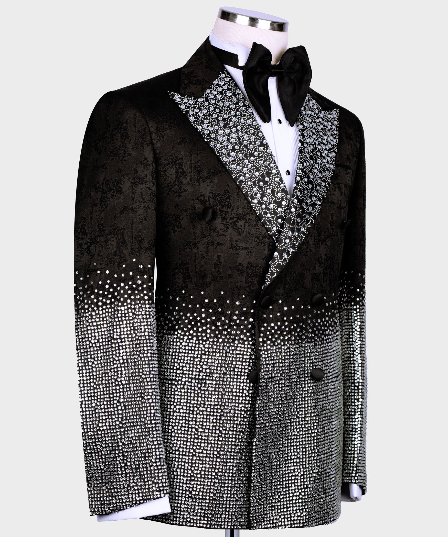 Special Tuxedo was designed by BLACKTUXEDOSTYLE and all crystals are fixed by handwork. The material of the suit is 100% Silk Satin. It can be made for special orders as well as design.