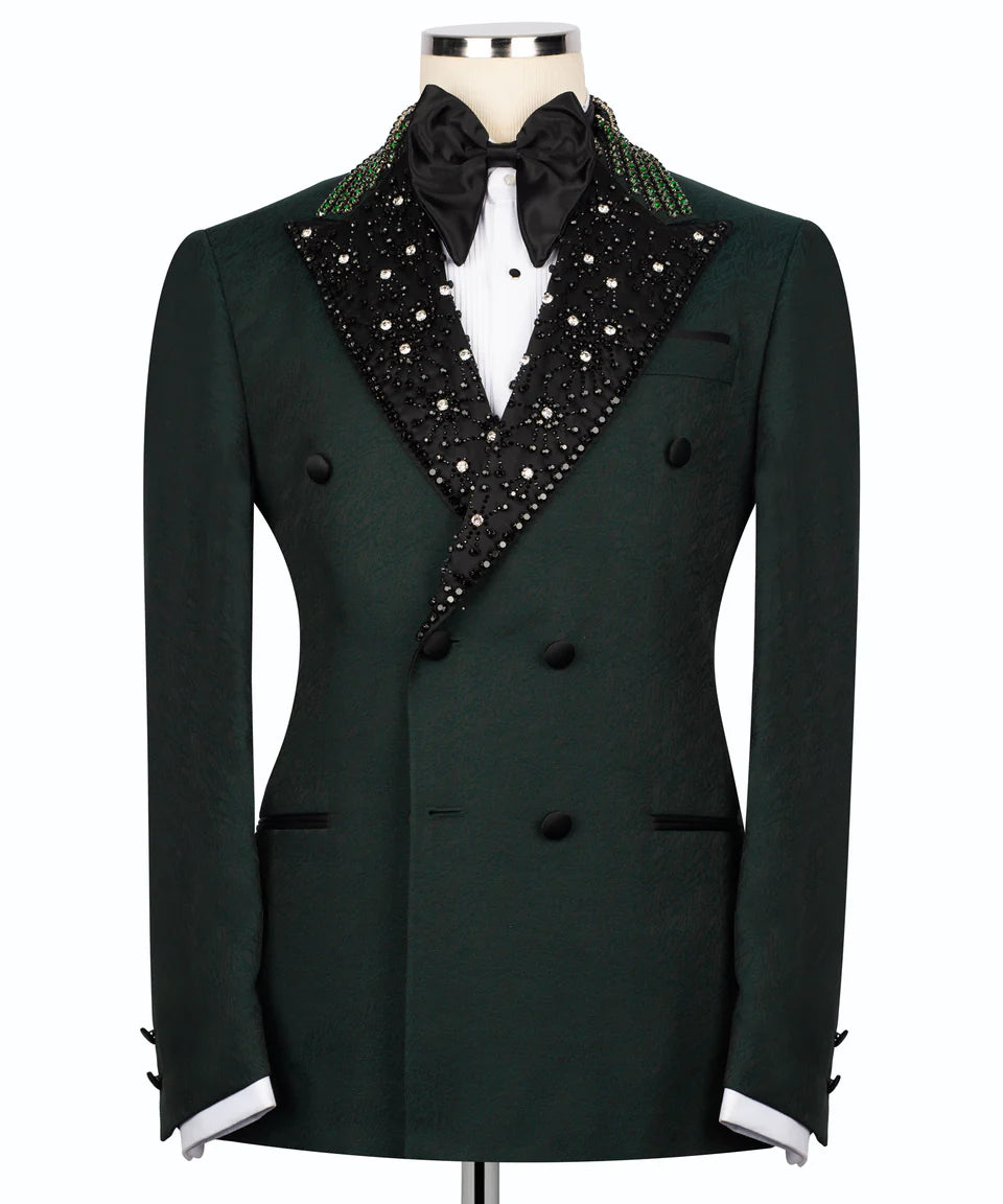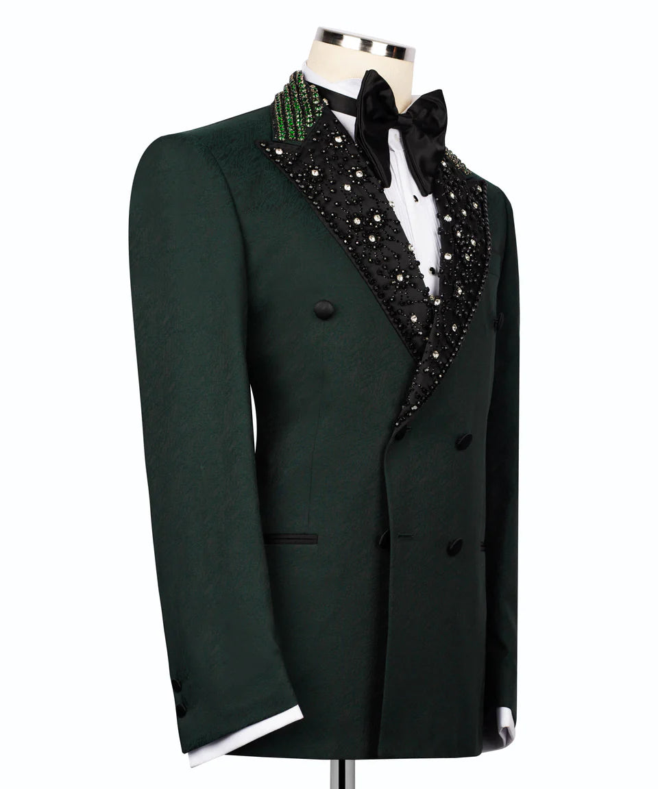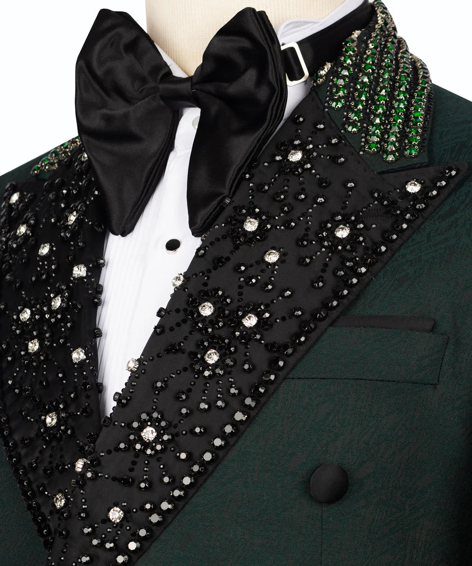 The crisp emerald green fabric provides a clean, sophisticated base, dramatically contrasted by the sharp black peak lapels. These lapels are the true highlight, completely covered in dazzling, hand-applied embellishments that catch the light from every angle. A sophisticated line of contrasting  black and emerald green embellishment traces the upper edge of the lapels, adding another layer of detail.