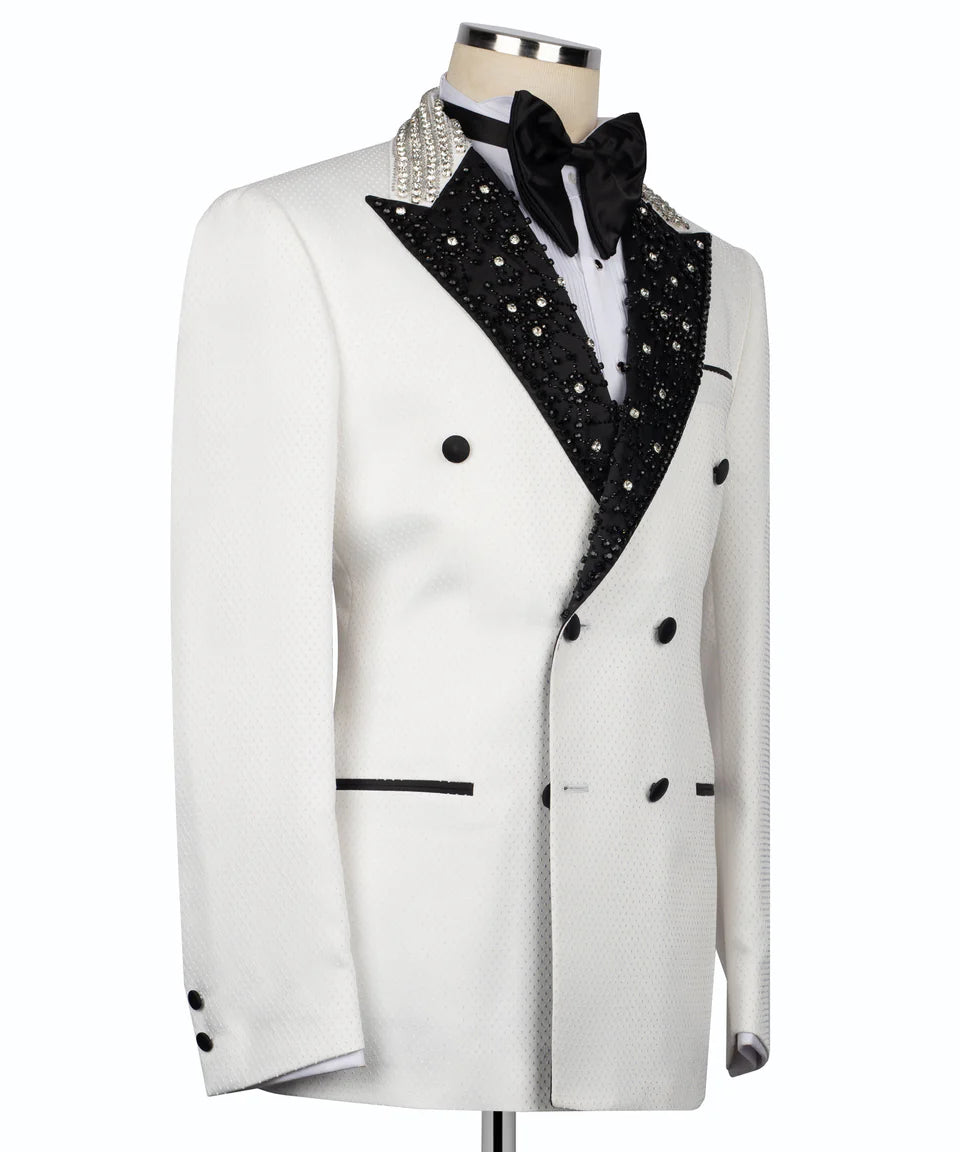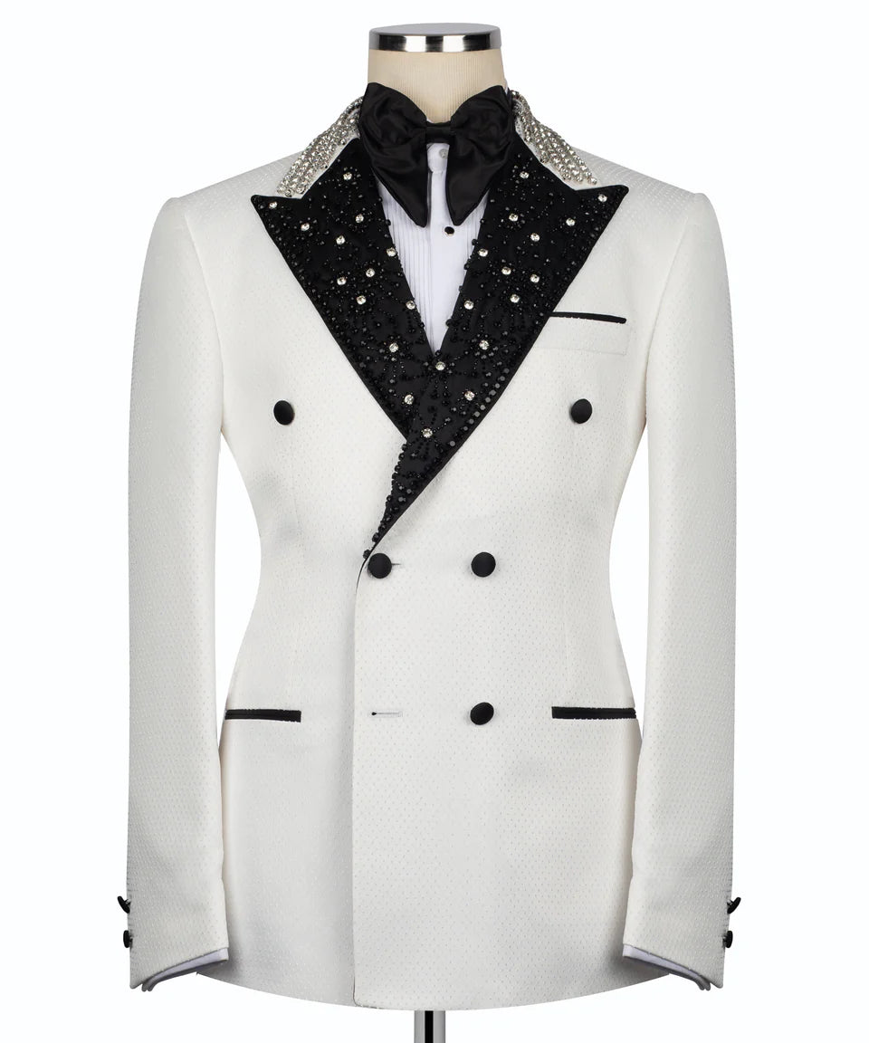 Make a grand entrance in this striking white double-breasted jacket, a fusion of classic tailoring and modern extravagance. This jacket is designed for those who dare to stand out at any formal event, gala, or special celebration.