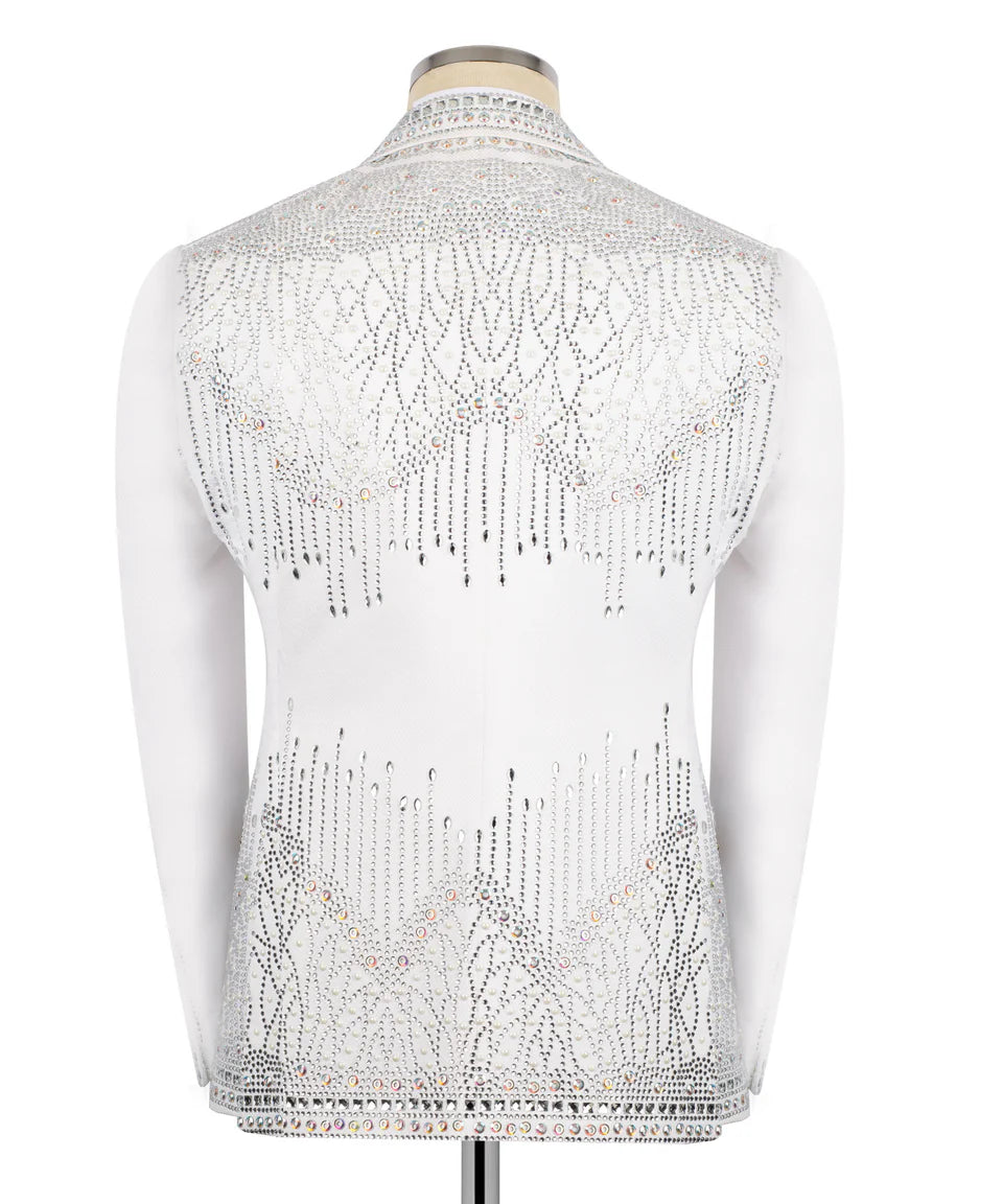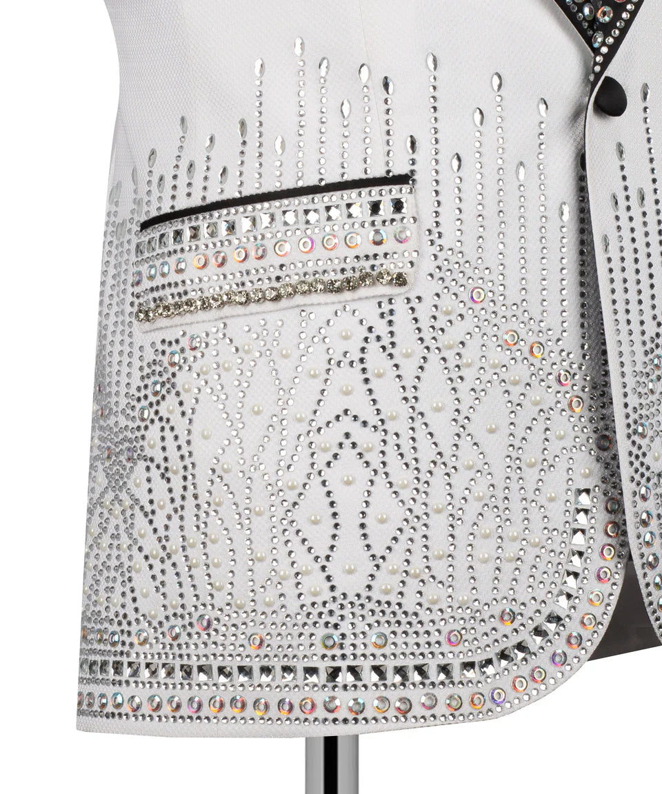 Make a powerful statement with The Full Embellished  White Tuxedo. This striking piece features fringe stone embellishments on a sleek white fabric, perfect for those who want to command attention at any special event. Its unique design and luxurious feel ensure an unforgettable presence. Expertly crafted, this jacket embodies Black Tuxedo Style's dedication to bold elegance and exceptional craftsmanship.
