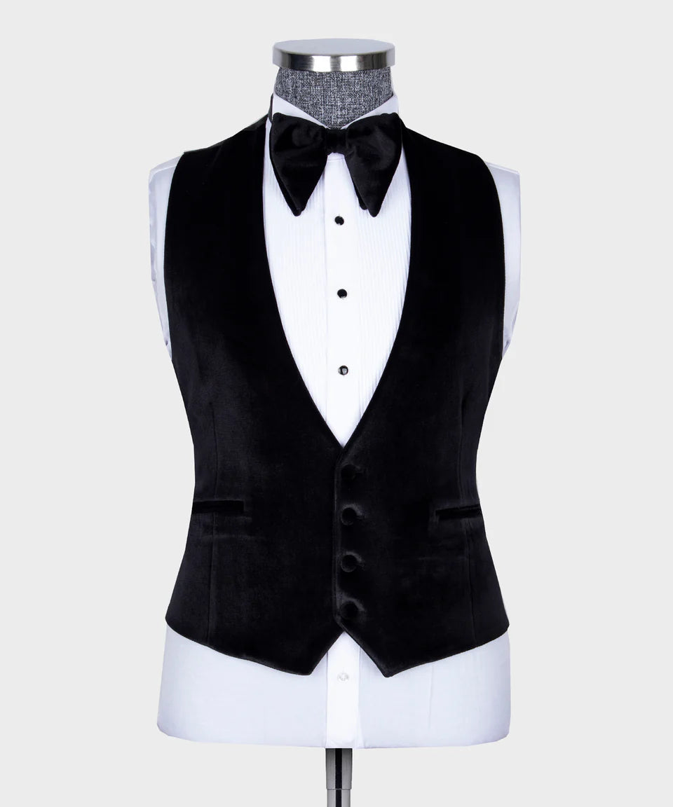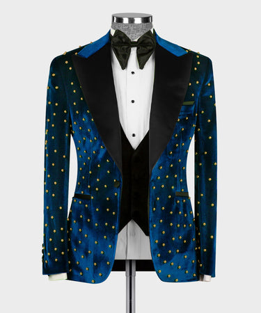 Black Tuxedo Style presents our stunning Blue Velvet Tuxedo featuring Gold Embellishments and a Black Velvet Vest. This luxurious three-piece suit includes a rich blue velvet blazer adorned with intricate gold detailing, a sophisticated black velvet vest, and matching black formal trousers. The blazer features a classic shawl lapel in black velvet and a modern one-button closure. Perfect for making a bold statement at weddings, parties, and any special occasion. Elevate your style with this unique Black Tuxedo Style creation.