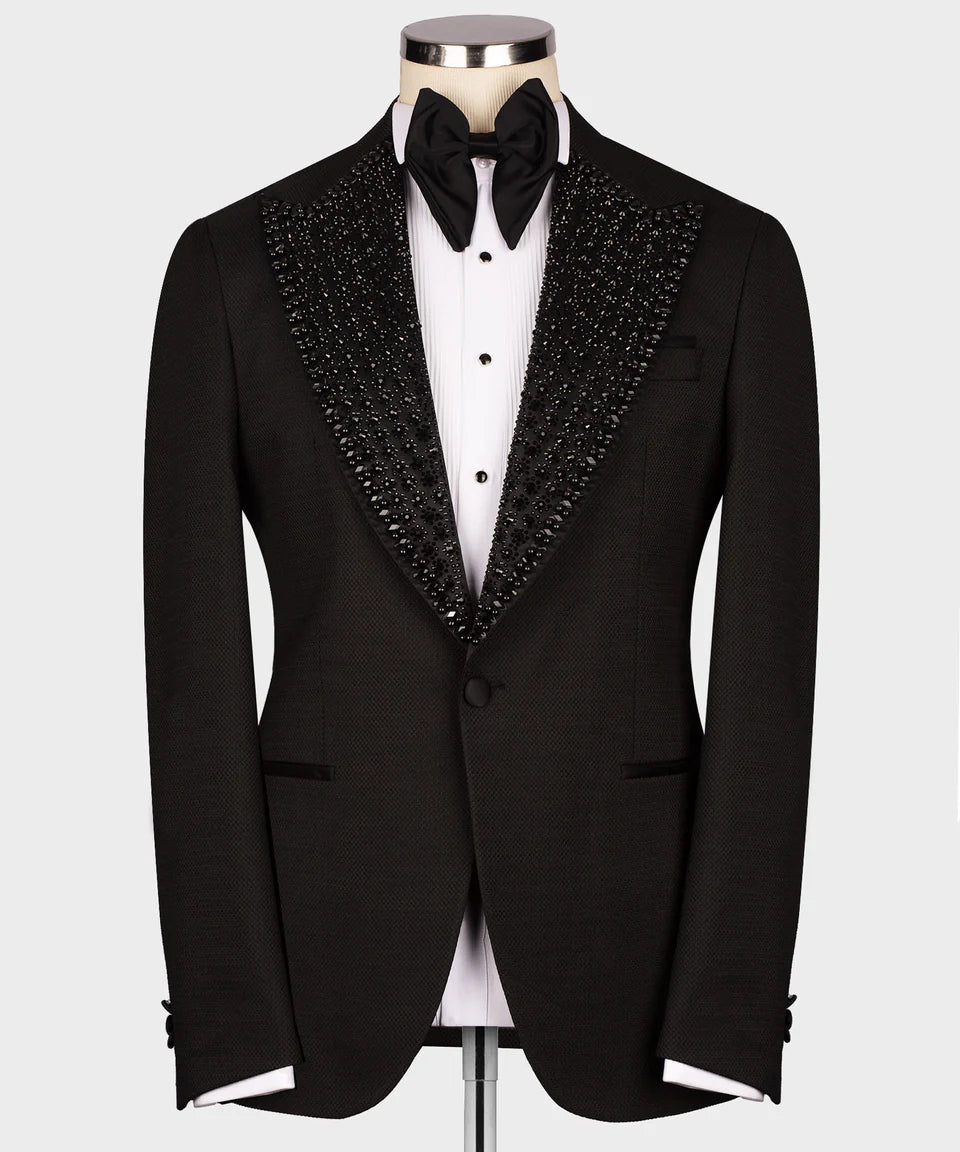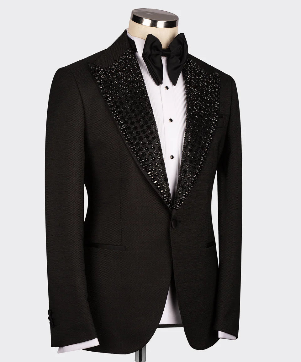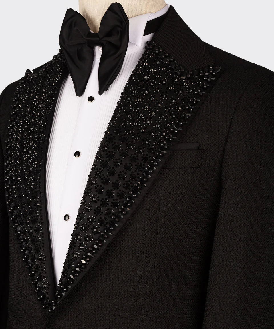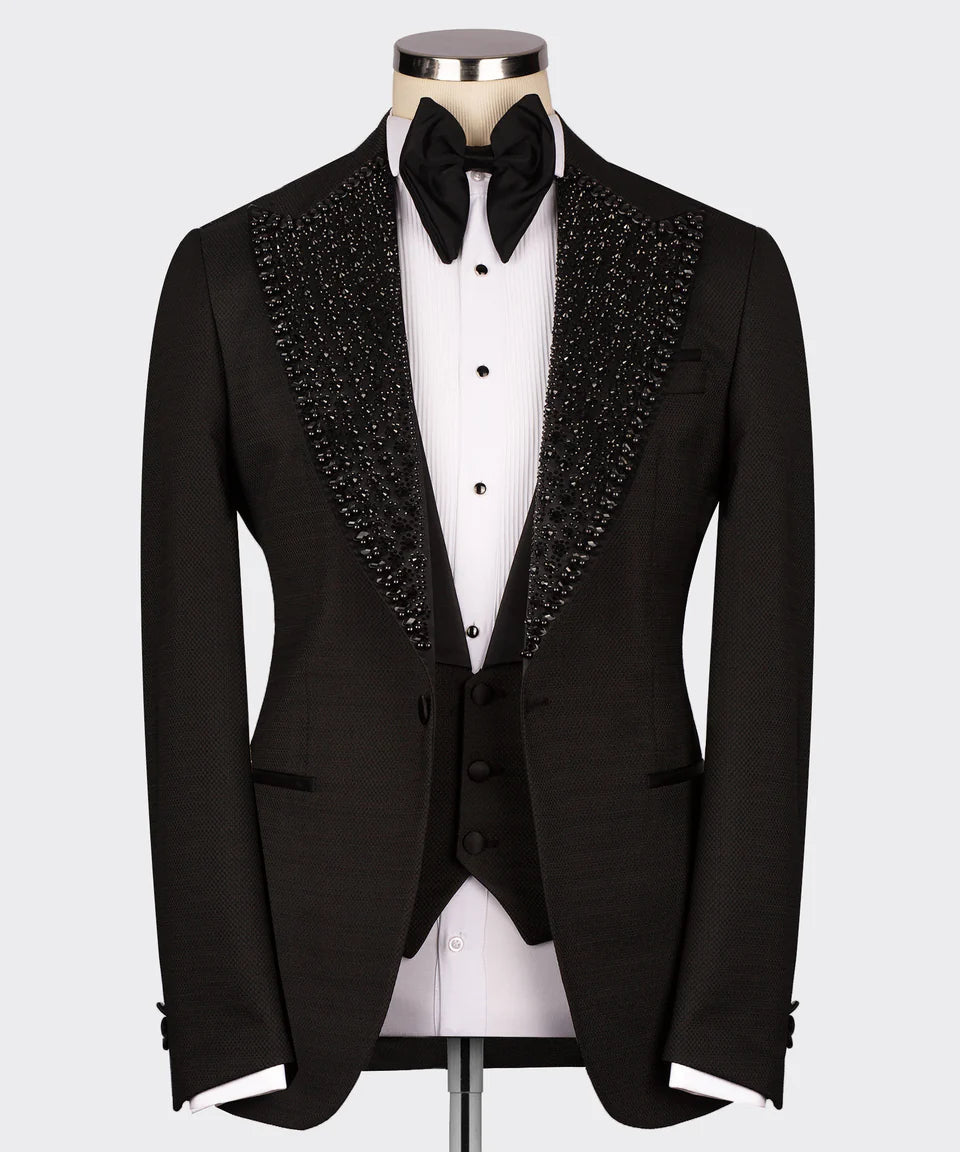 Command attention in this sleek and sophisticated Black Tuxedo from Black Tuxedo Style. This tuxedo is the epitome of modern elegance, featuring a sharp, single-button jacket with a luxurious black satin shawl lapel. The lapel is meticulously embellished with shimmering black stones, creating a subtle yet striking texture that catches the light just right. As a complete three-piece set, it includes a stylish black vest and perfectly tailored trousers, ensuring a polished and cohesive look for any formal occasion. Whether you're attending a black-tie event, a wedding, or a special celebration, this Black Tuxedo Style creation will ensure you make a lasting impression with its understated yet distinctive style.