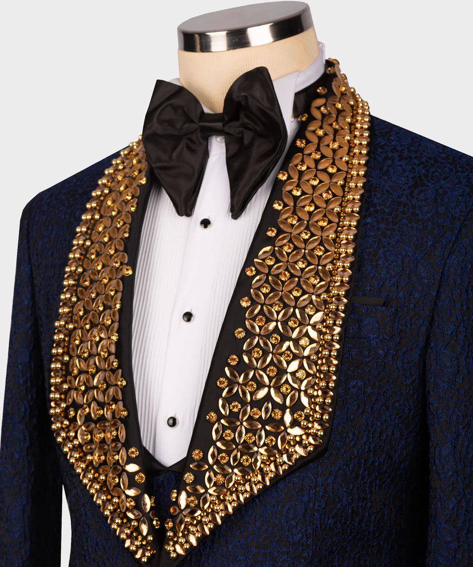 Black Tuxedo Style | Navy Blue Tuxedo with Gold Stone Embellishments (3 Piece)
