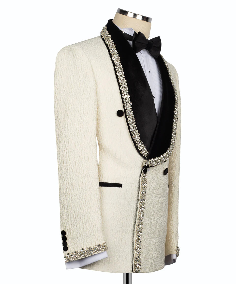Make an unforgettable entrance with this spectacular Cream Tuxedo Jacket from Black Tuxedo Style. Crafted in a luxurious ivory fabric with a subtle texture, this jacket is a true showstopper. It features classic black velvet peak lapels, lavishly adorned with intricate patterns of shimmering crystal embellishments. This dazzling crystal stone embellishment extends across the shoulders and down the sleeves, creating a brilliant effect that catches the light from every angle. Styled with a likely double-breasted closure, sleek jetted pockets accented with black piping, and crystal-embellished buttons on the cuffs, this jacket is designed for maximum impact. Perfect for red carpet events, galas, or any special occasion where you want to exude confidence and unparalleled style with rich texture and opulent detail.
