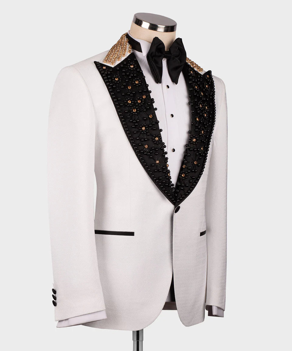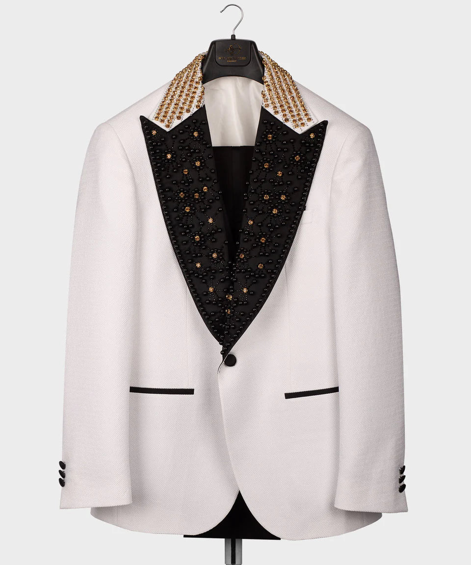 Elegant White Tuxedo with Black Shawl Lapel & Gold Stone Detailing