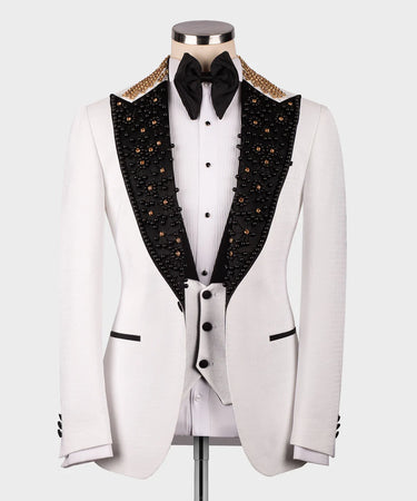 Elevate your formal style with this exquisitely detailed White Tuxedo from Black Tuxedo Style. This tuxedo offers a unique and sophisticated look with its delicate black and gold bead embellishments on the jacket. The classic single-button jacket features a luxurious black satin shawl lapel that is elegantly lined with rows of small black beads, interspersed with larger, shimmering gold or amber-toned stones. This refined detailing continues along the shoulders and down the front of the jacket, creating a subtle yet eye-catching effect. As a complete three-piece set, it includes a matching white vest with a stylish black satin lapel and black buttons, and perfectly tailored trousers. Perfect for weddings, galas, or any special occasion where you want to add a touch of understated luxury and timeless elegance to your ensemble, this Black Tuxedo Style creation is sure to impress.