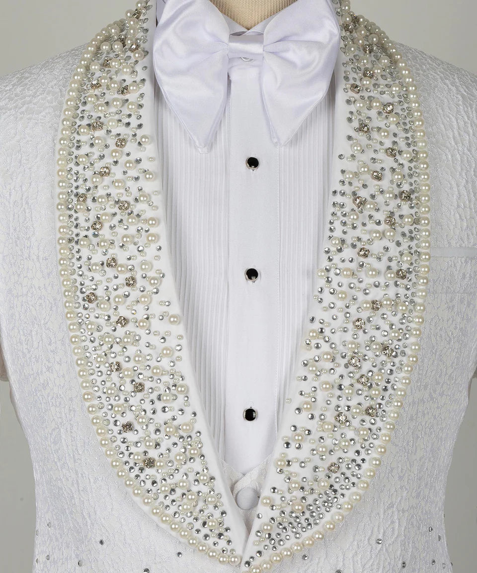 The Vest: Providing a layer of classic elegance is the coordinating white waistcoat. Crafted from complementary fabric, it features refined satin lapels, offering a smooth textural contrast and allowing the jacket's radiant embellishments to truly shine.