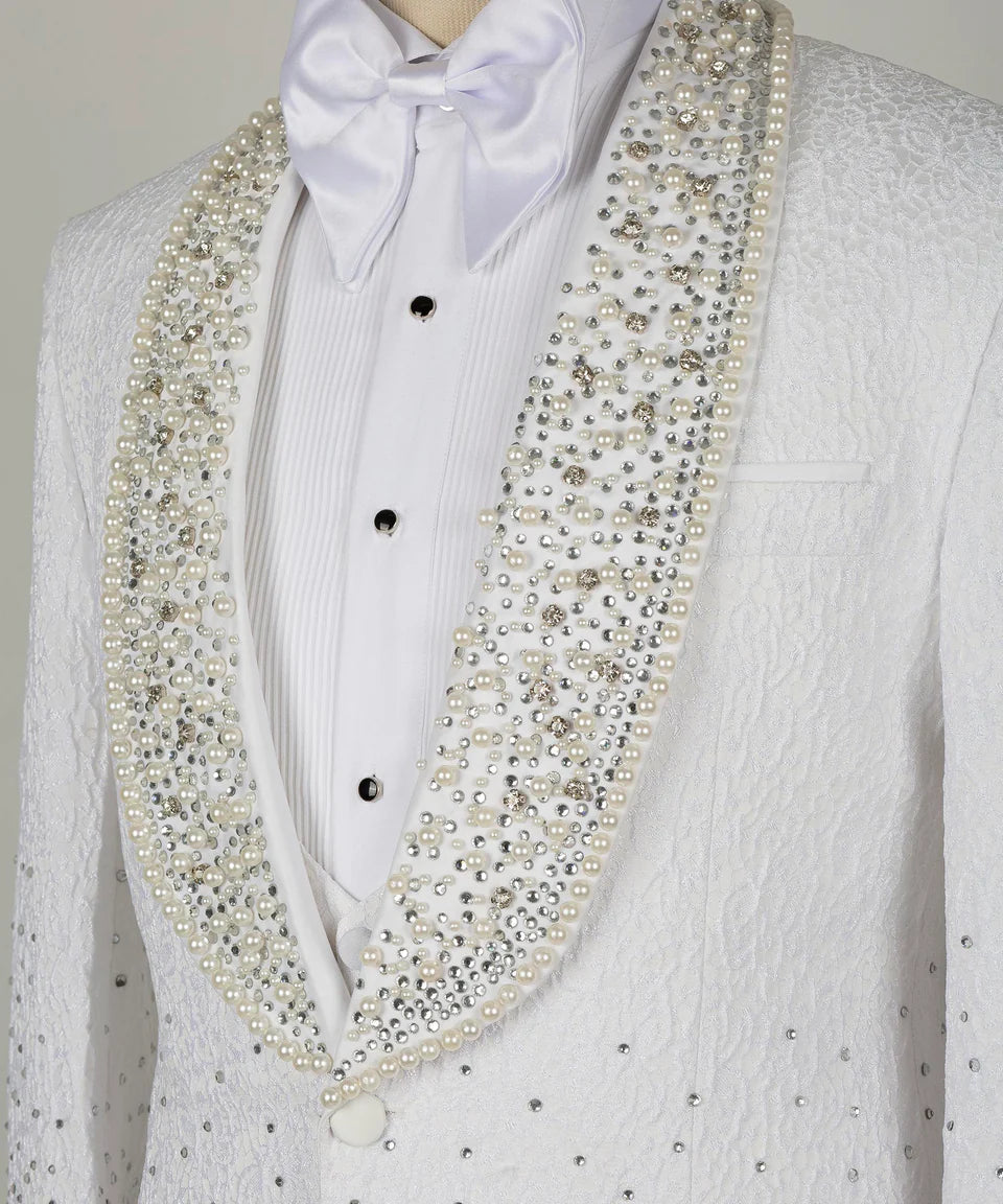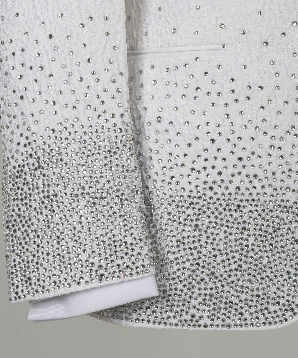 Embrace radiant luxury. Shine from every angle with this Gradient Crystal Embellished White Tuxedo from Black Tuxedo Style.