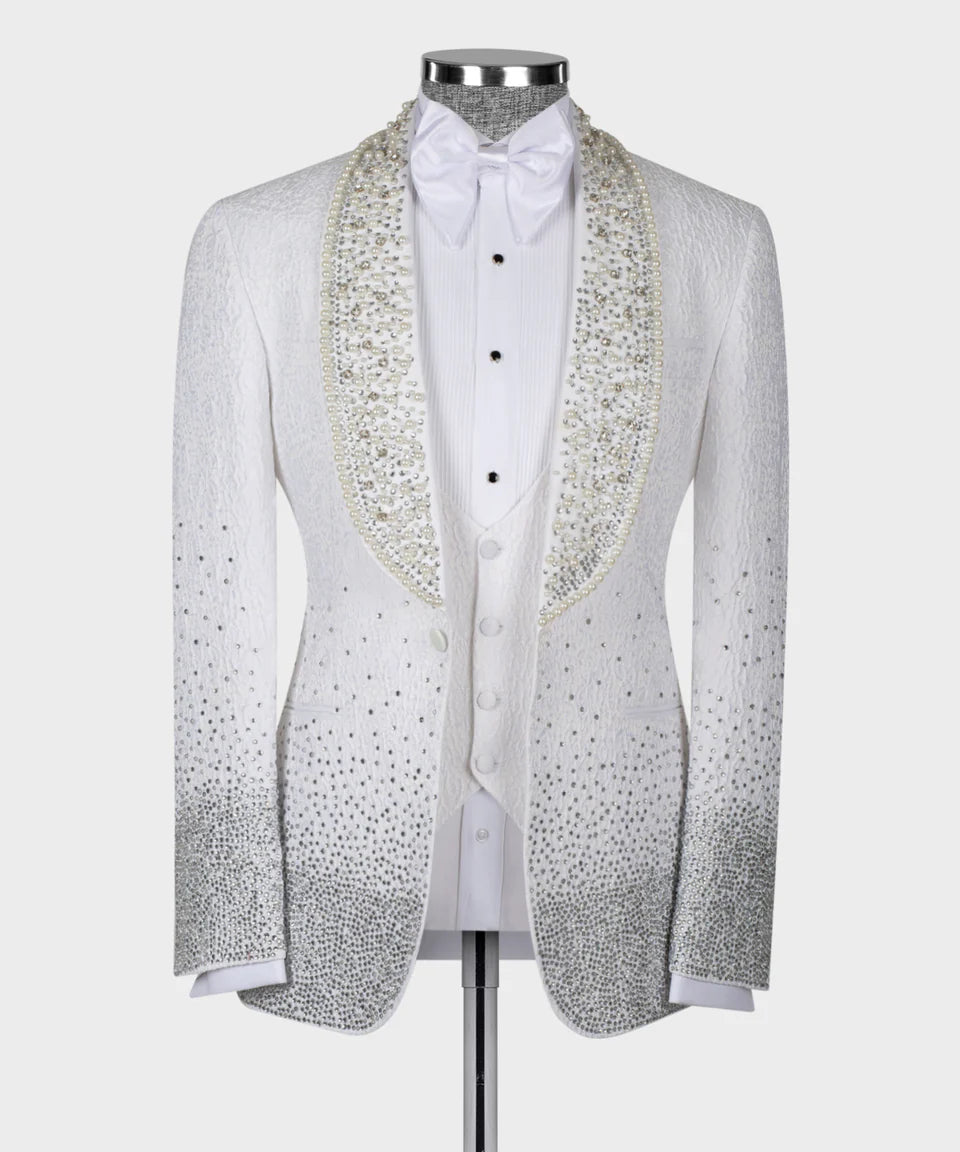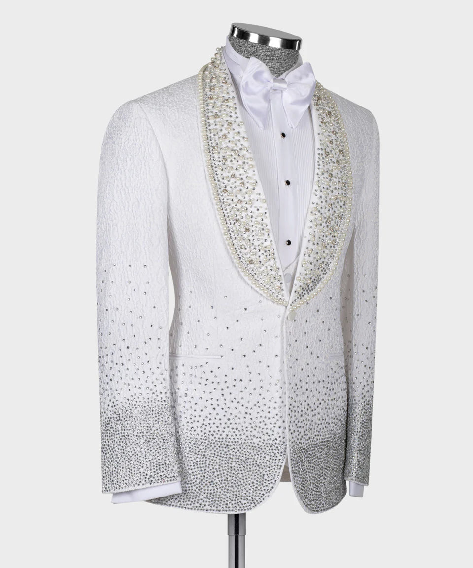 Handcrafted Gradient Crystal Embellished White Tuxedo - 3 Piece Suit