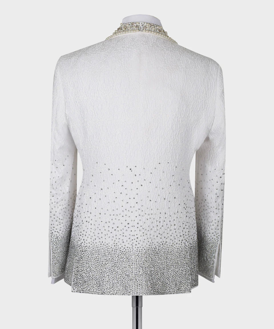 The Jacket: The single-breasted jacket is a masterpiece of design, crafted from premium white textured jacquard fabric (our quality 60% Wool / 40% Silk blend). It features stunning, hand-applied embellishments of brilliant clear/silver crystals/stones, potentially accented with pearls. The integrated lapel/shoulder area is lavishly decorated, creating a regal frame. A mesmerizing gradient effect then takes over, with crystals scattering downwards and becoming increasingly dense towards the hemline and cuffs on the front panels, sleeves, and across the entire back, creating a cascading sparkle effect.