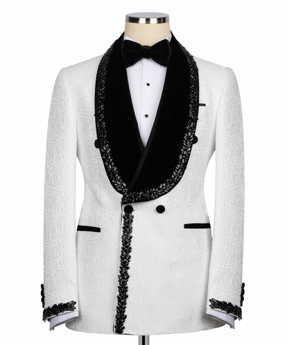 Make an unforgettable entrance with this spectacular White Tuxedo Jacket from Black Tuxedo Style. Crafted in a luxurious white fabric with a subtle texture, this jacket is a true showstopper. It features classic black velvet peak lapels, lavishly adorned with intricate patterns of shimmering crystal embellishments. This dazzling black stone embellishment extends across the shoulders and down the sleeves, creating a brilliant effect that catches the light from every angle. Styled with a likely double-breasted closure, sleek jetted pockets accented with black piping, and black crystal-embellished buttons on the cuffs, this jacket is designed for maximum impact. Perfect for red carpet events, galas, or any special occasion where you want to exude confidence and unparalleled style with rich texture and opulent detail.
