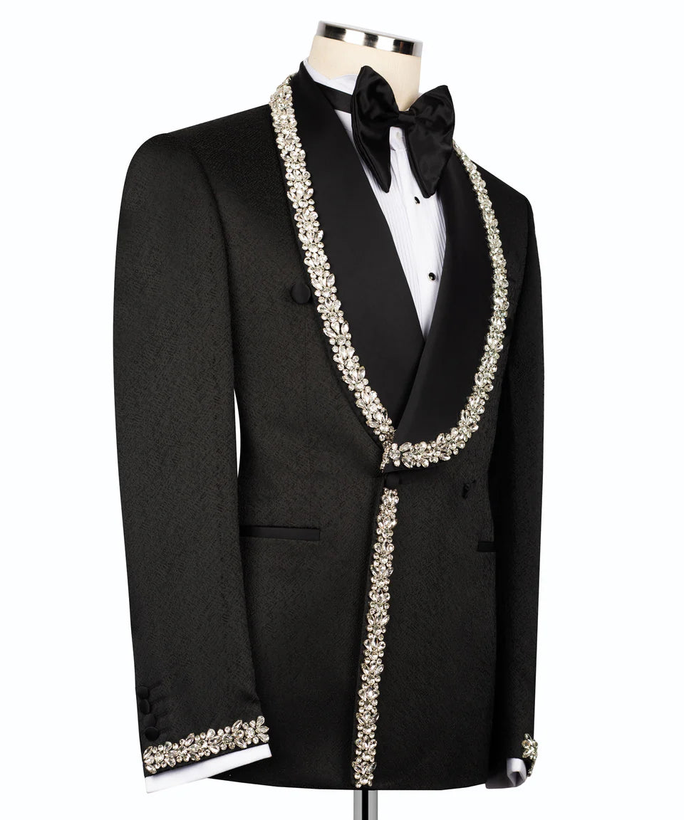 Make a spectacular entrance with this dazzling Black Double Breasted Tuxedo from Black Tuxedo Style. This striking three-piece set is designed to make you shine. The black jacket features classic black satin peak lapels and is lavishly adorned with intricate crystal stone embellishments. These shimmering stones cover the lapels, shoulders, front of the jacket, and cuffs, creating a brilliant and captivating pattern. Styled with a single-button closure and sleek jetted pockets, the jacket is a true statement piece. Completing this distinguished set are classic black tuxedo pants, perfectly tailored for a sharp silhouette. This Black Tuxedo Style tuxedo is ideal for black tie events, galas, premieres, or any special occasion where you want to exude confidence and unparalleled style with opulent detailing.