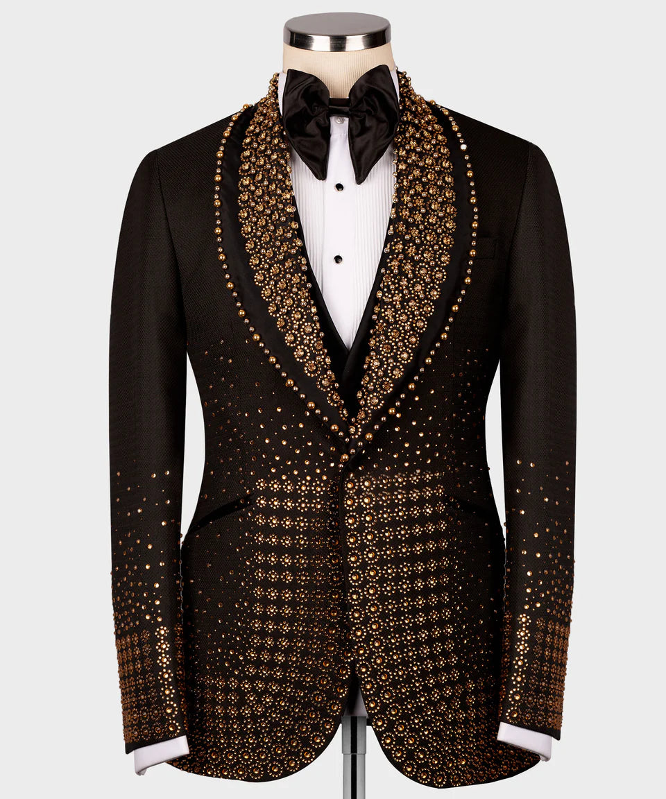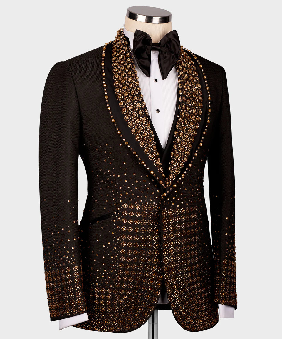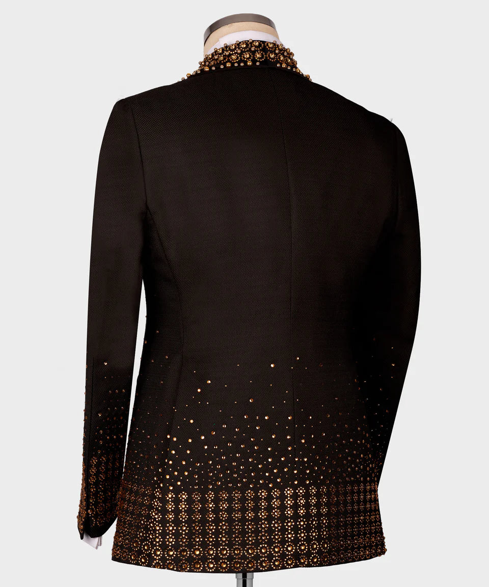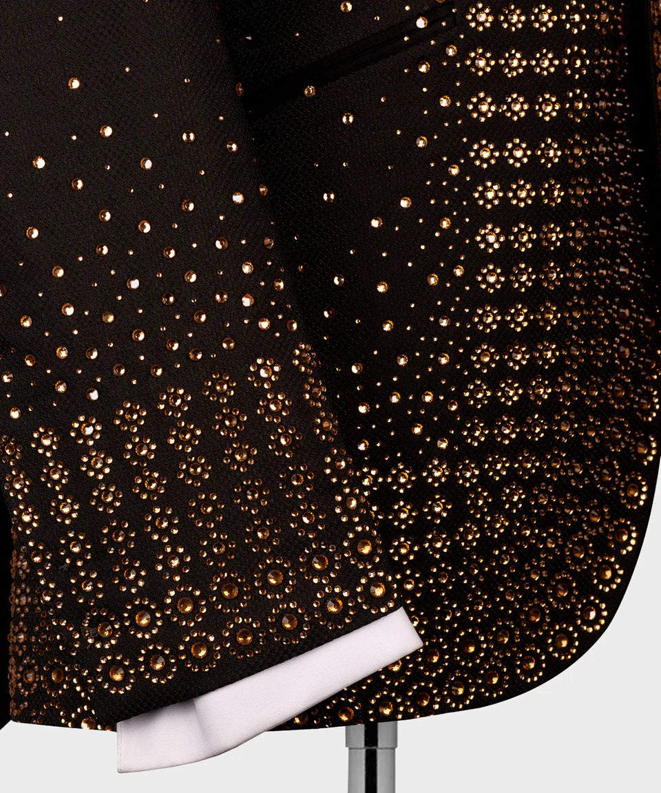 Make an unforgettable golden statement in this spectacular black tuxedo jacket, dazzling with luxurious gold crystal embellishments. Designed for the spotlight, this jacket is perfect for galas, red carpet events, or any occasion where you want to shine.