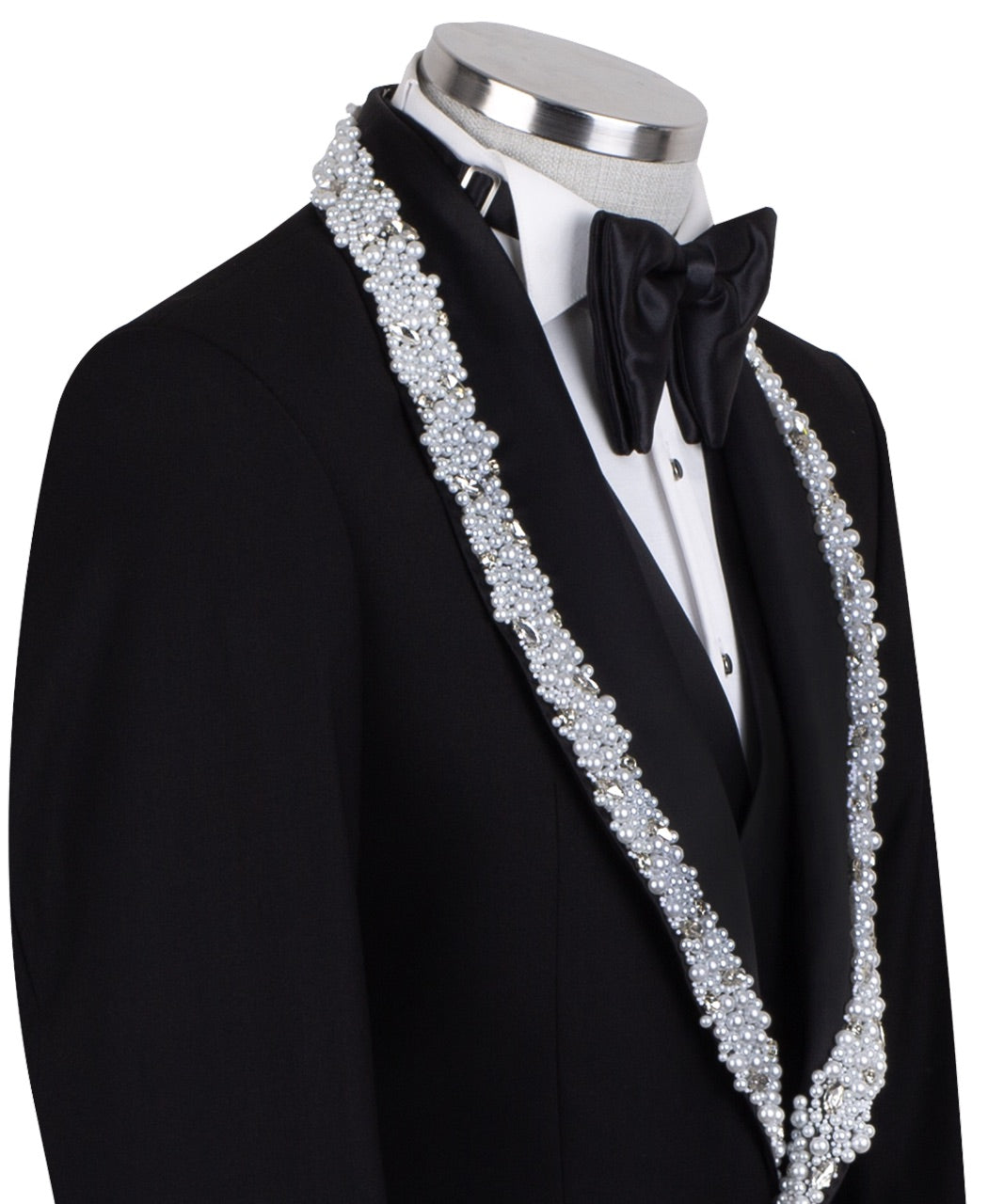 The Pearl-Lined Jacket: A deep black jacket with a stunning shawl lapel framed by hand-placed pearls for a soft, radiant look.