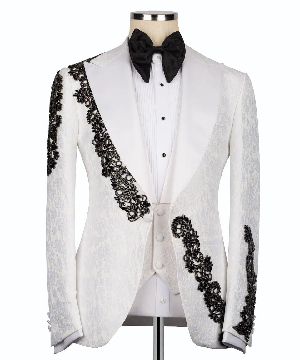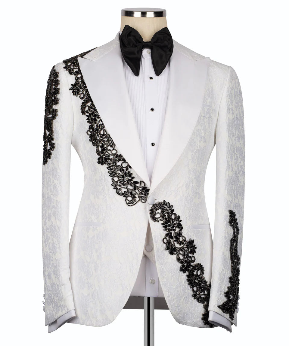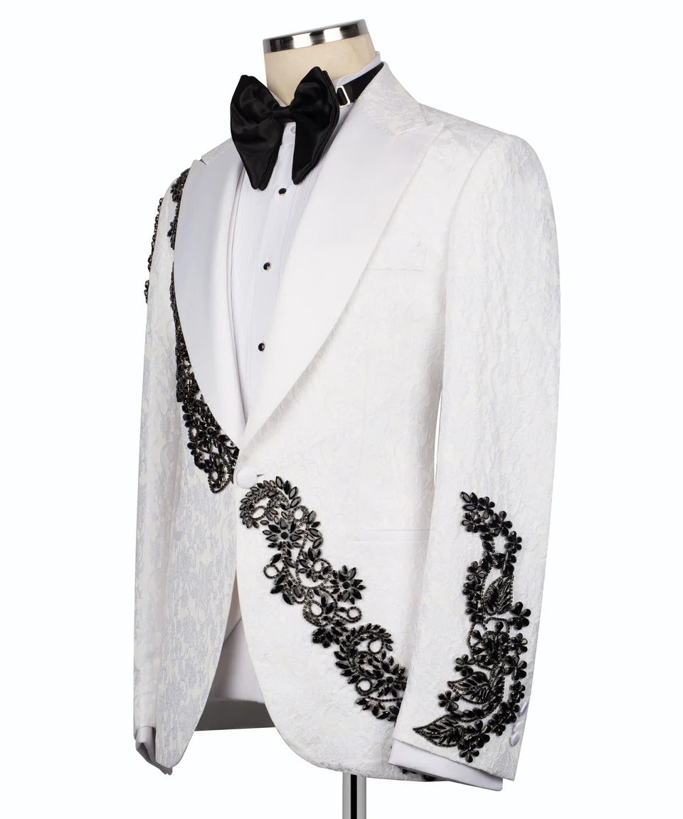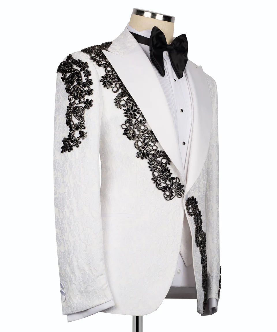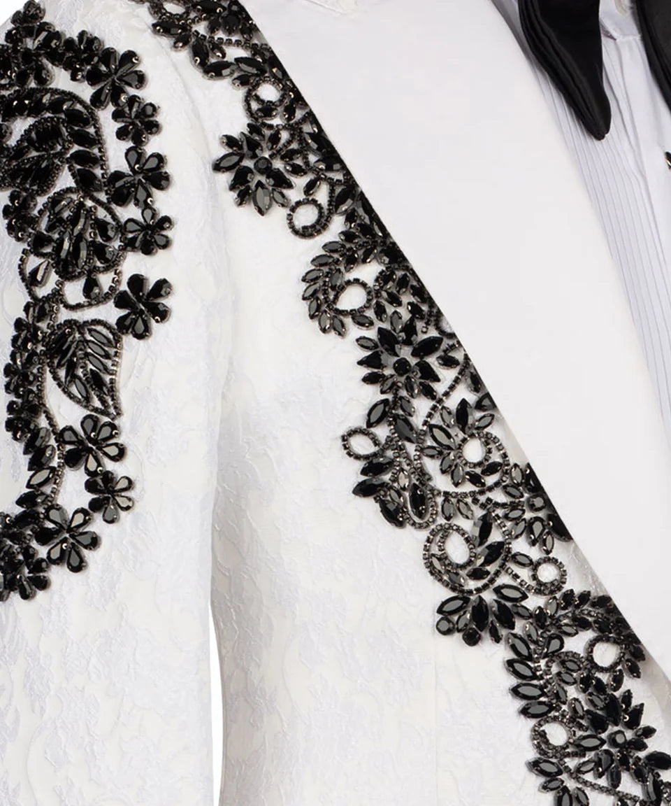 Statement White Tuxedo with Black Embroidery Detail | Black Tuxedo Style