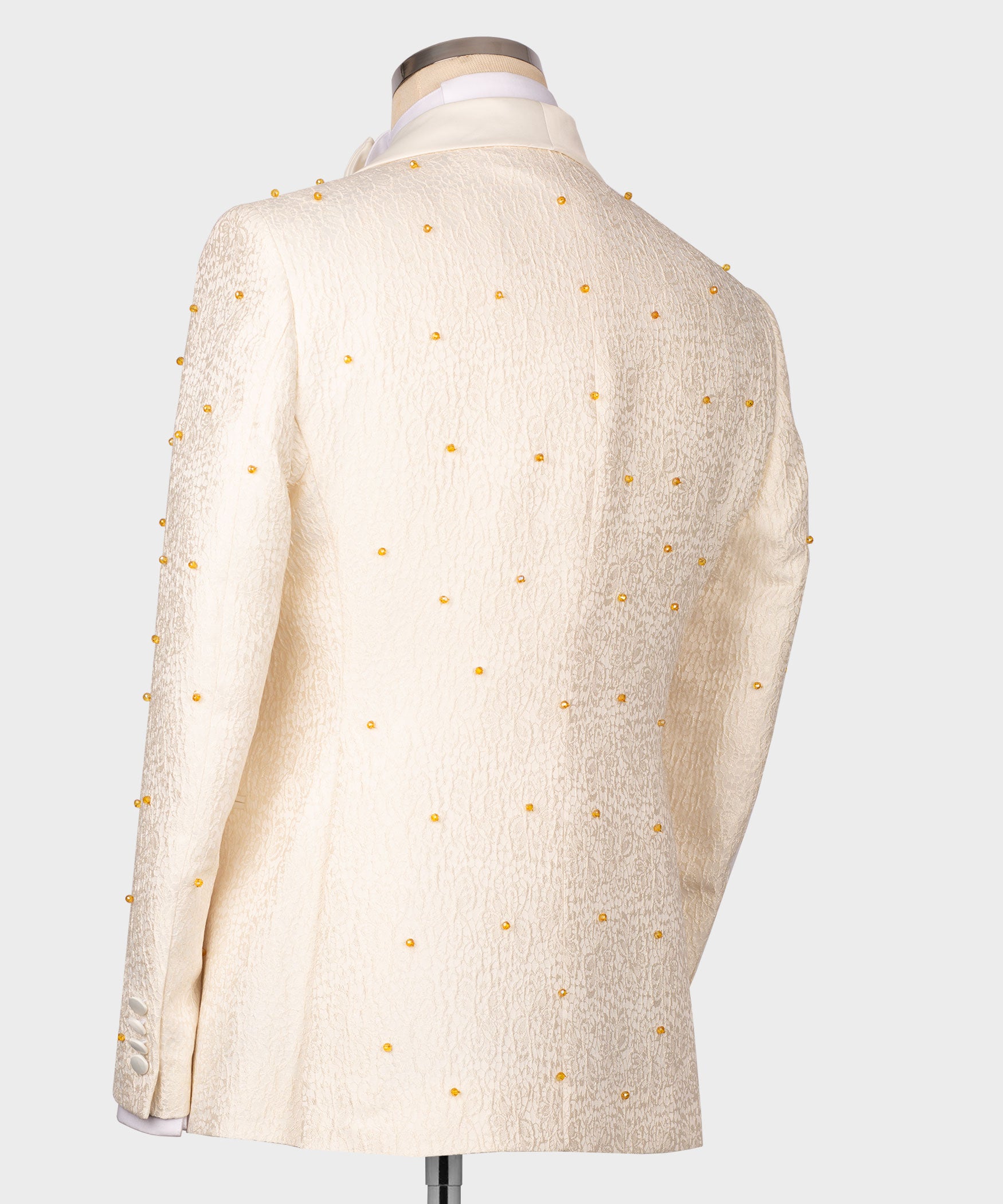Los esmóquines exclusivos a medida le permiten disfrutar de la comodidad y la elegancia a la vez. Confeccionados en seda y lana, con un botón, dos aberturas traseras y pantalón de esmoquin color crema. Se pueden confeccionar en cualquier talla ( tarda cuatro días ) por encargo. El traje incluye chaqueta, chaleco, pantalón y pajarita.