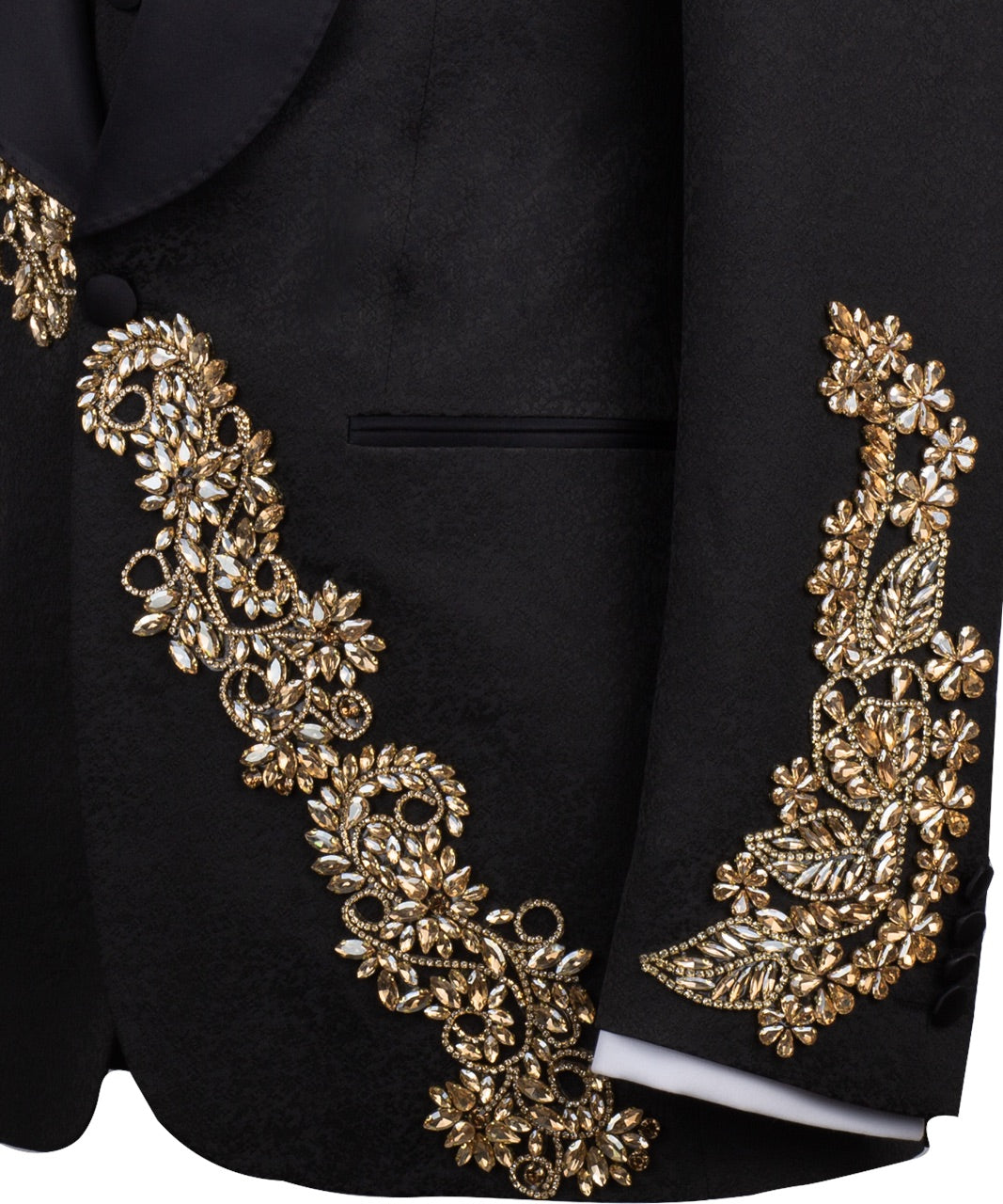 The Harmony Jacket: A beautifully tailored black jacket featuring warm, hand-applied gold floral patterns on the shoulders, lapels, and hem.