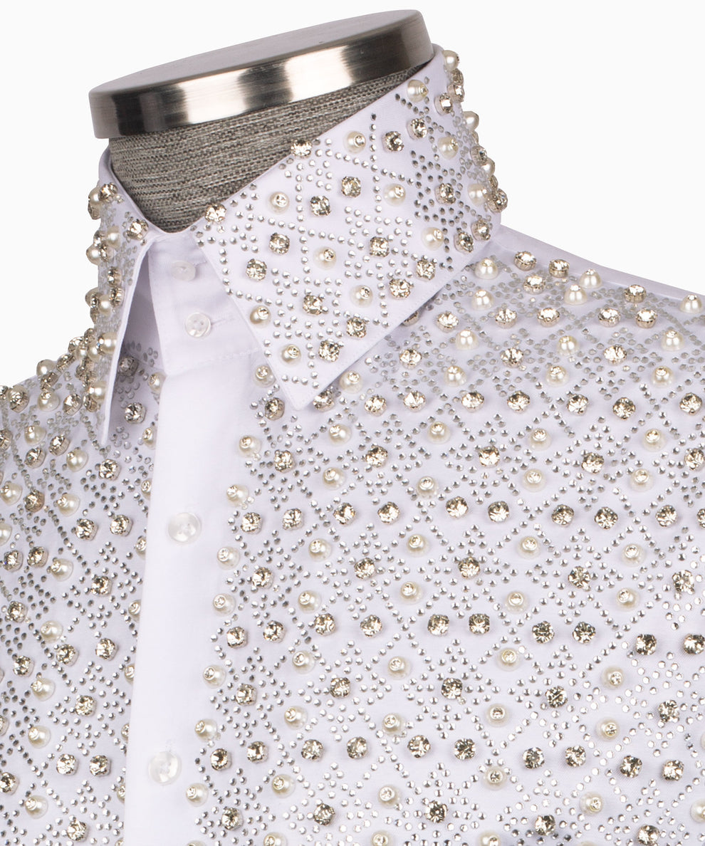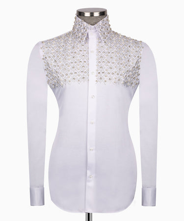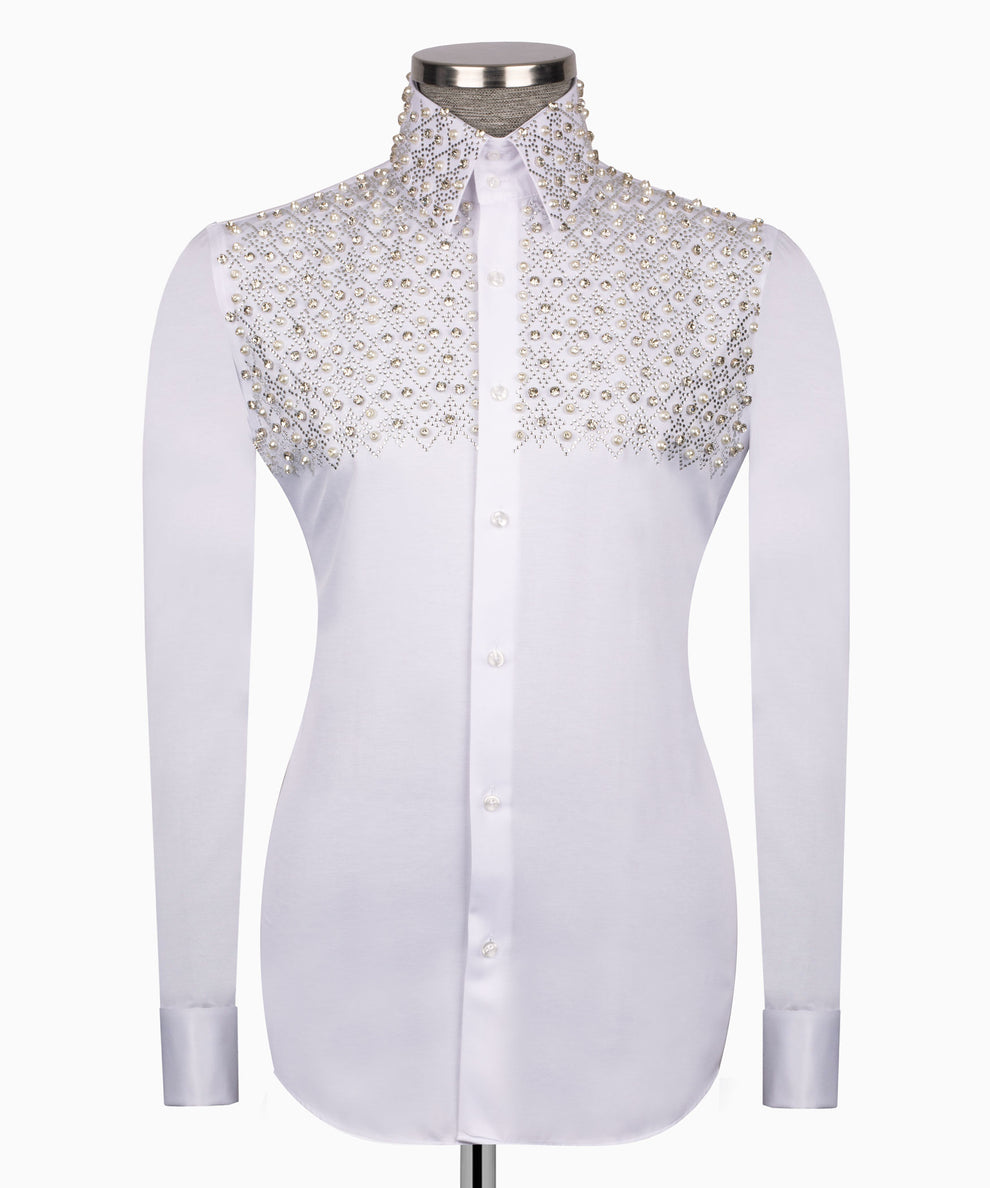 Camisa blanca elegante con estampado geométrico y detalles en piedra