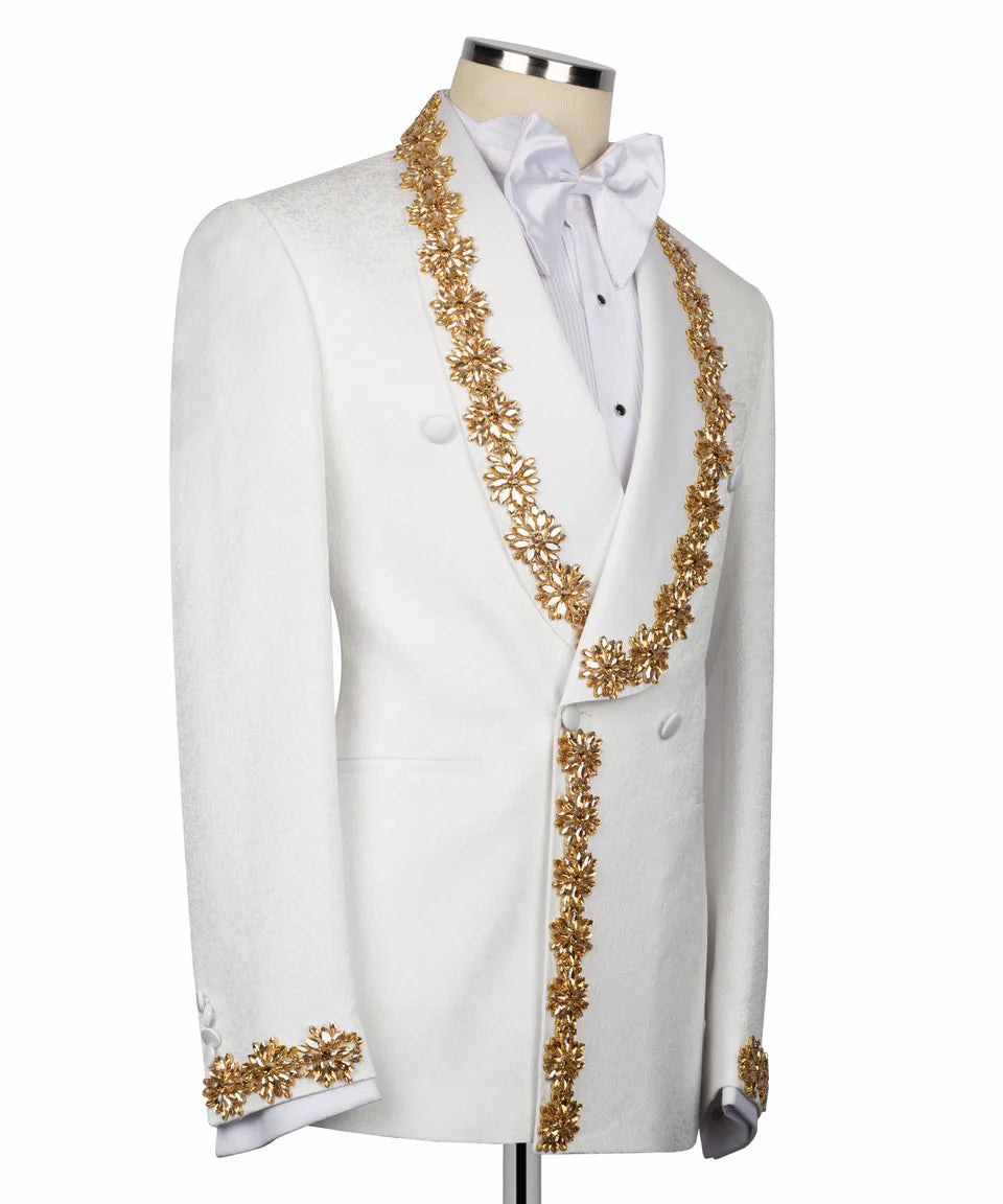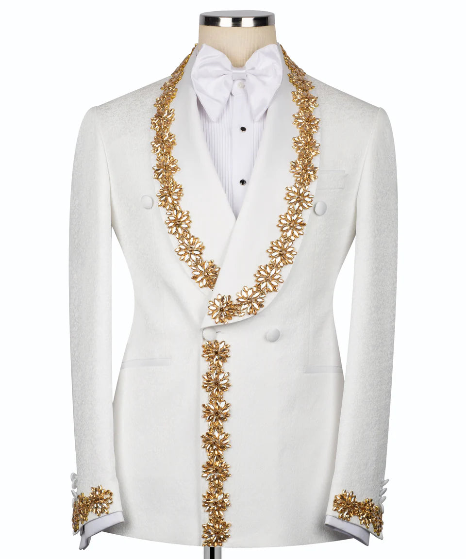White Tuxedo with Floral Gold Stone Embellishments | Black Tuxedo Style - Costum Tuxedo | Black Tuxedo Style