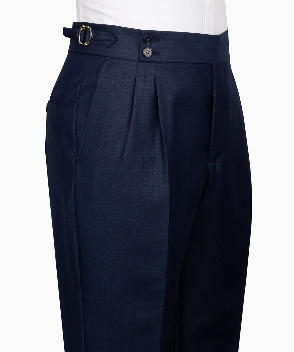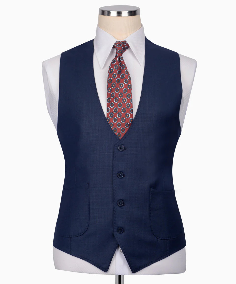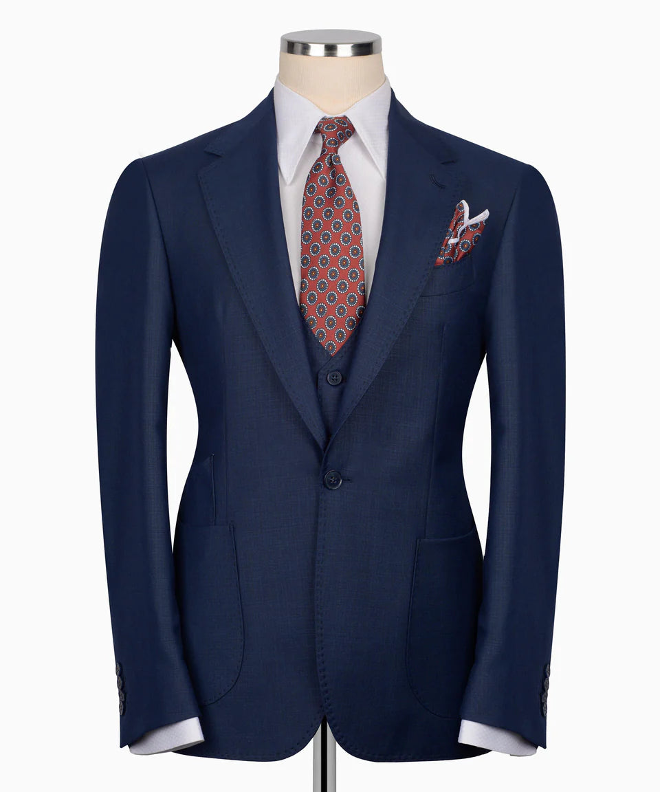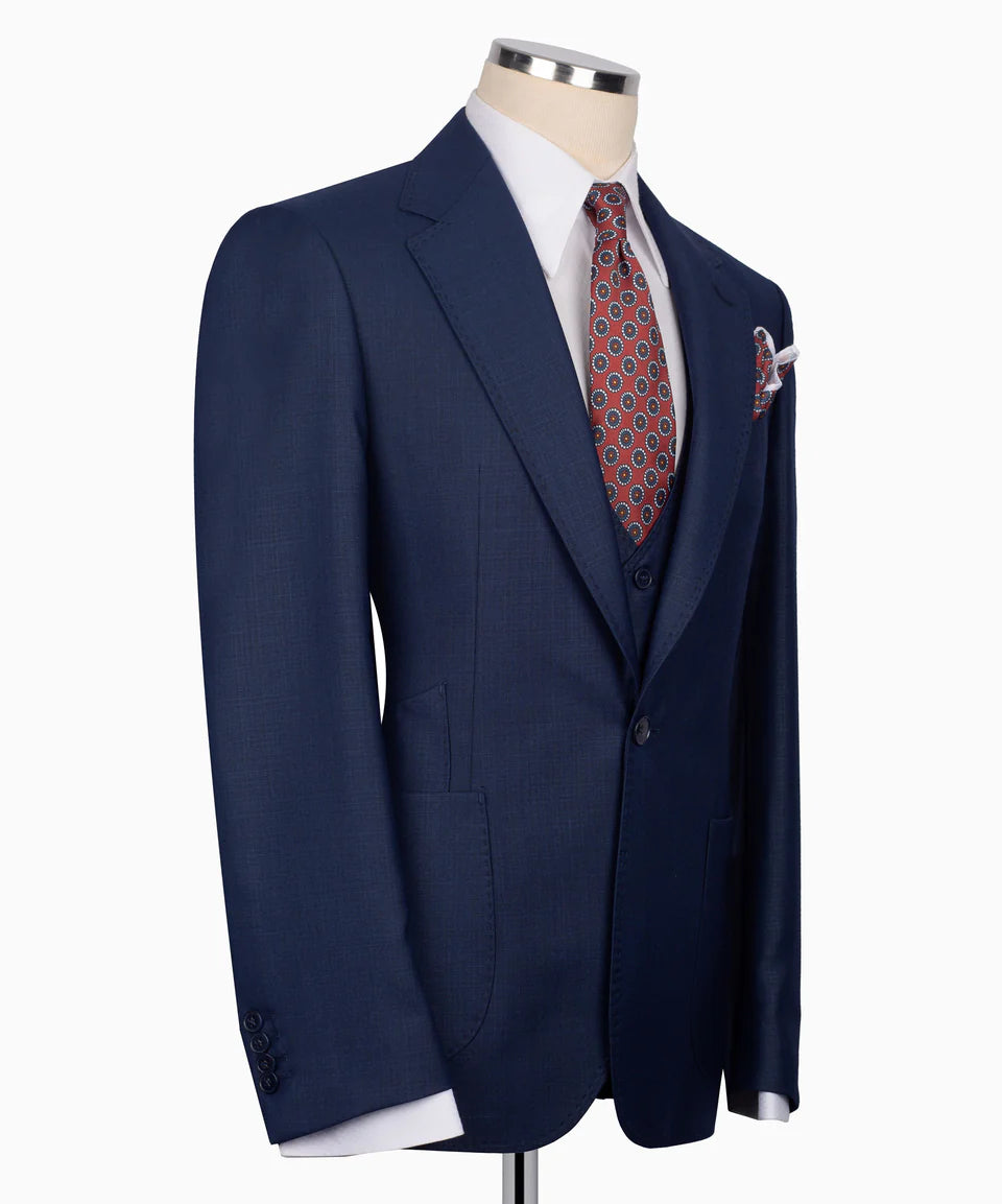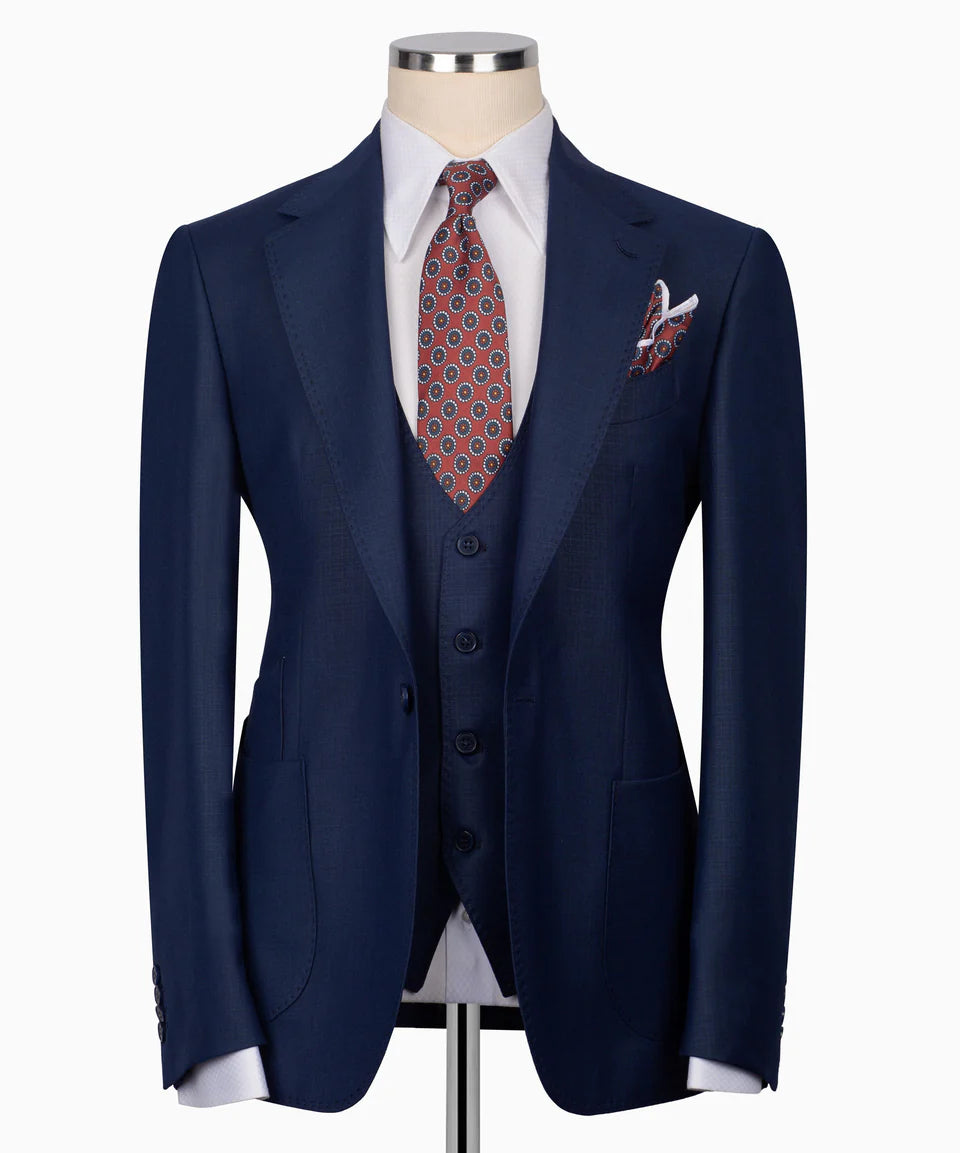Make a statement of sophisticated style with this exquisite Navy Blue 3 Piece Suit from Black Tuxedo Style. Crafted in a premium fabric with a distinctive texture, this complete suit set features a navy blue base hue with subtle earthy undertones. The single-button jacket boasts sharp peak lapels and stylish jetted pockets with flaps, finished with classic dark buttons on the cuffs. The matching single-breasted vest features a refined V-neckline and prominent dark buttons, adding a layer of traditional style. Completing the set are perfectly tailored trousers made from the same distinguished navy blue fabric. This Black Tuxedo Style suit is ideal for business, weddings, or any occasion where you want a sharp, polished, and uniquely colored look with a sophisticated pattern.