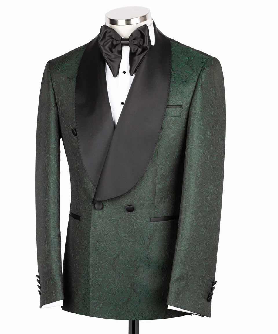Men's Patterned Green Tuxedo Jacket with Black Satin Lapel & Trousers