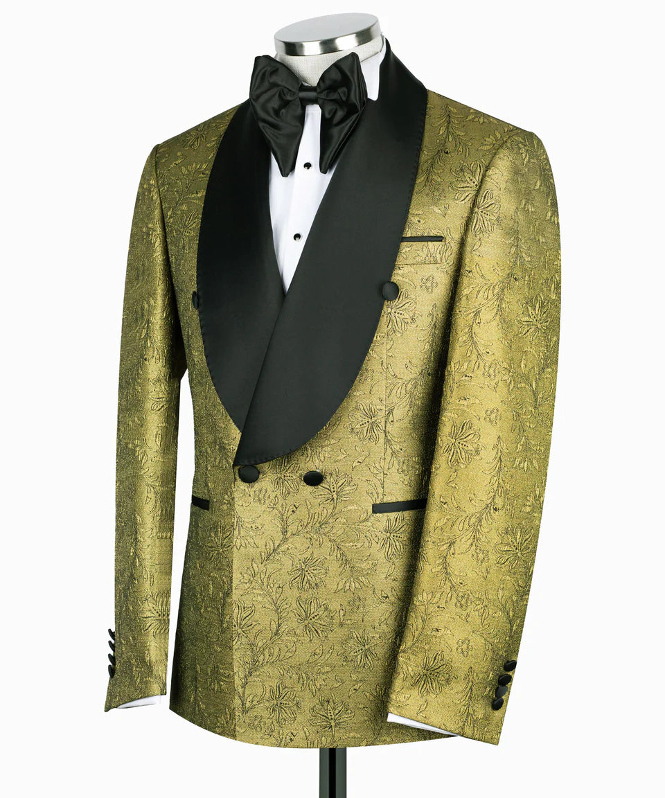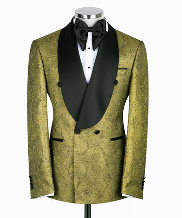 Patterned Gold & Black Tuxedo Suit - DB Jacket, Satin Detail Trousers